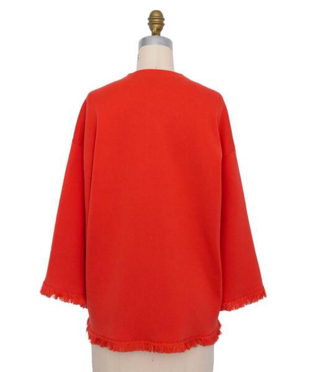 ■デザインフリンジ使いがアクセントのニットジャケット。バックは立体的なラインで動きのあるシルエットに仕上げています。