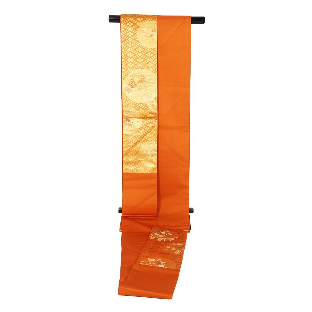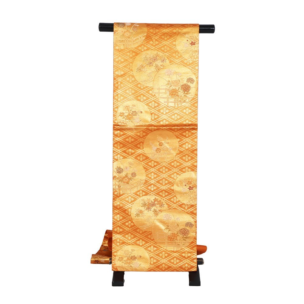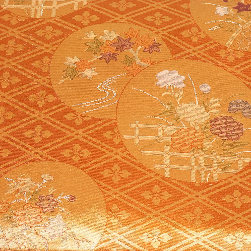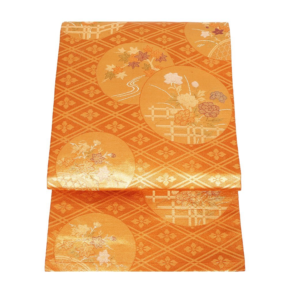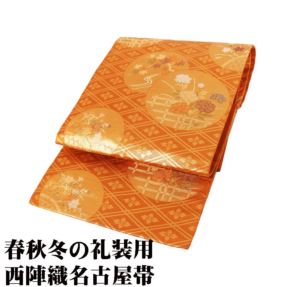 | 西陣織名古屋帯 金茶・金地 花菱文・花丸文 牡丹・紅葉・桔梗 未使用品 仕立て上がり | |