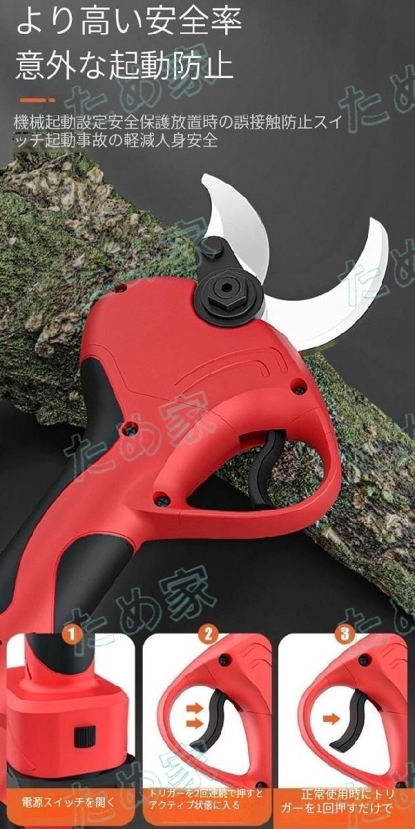 ? このコードレス剪定せん断は、あなたの庭を簡単に機能させることができます。 軽量でポータブルなハンドルは、人間のエンジニアリング設計に適合し、使いやすく、努力を節約します。 電気剪定の品質は、手動プルナーと比較して大幅に高くなっています。? 果樹園、小さなブドウ園、または家庭用の剪定バラや装飾用植物に電気剪定せん断を使用することができます。また、私道から突き出ている松の枝を取り除くこともできます。