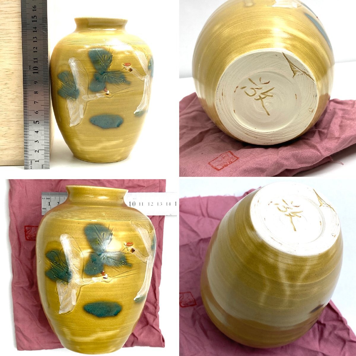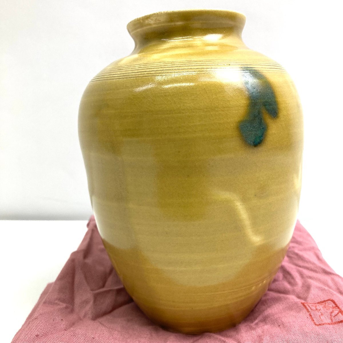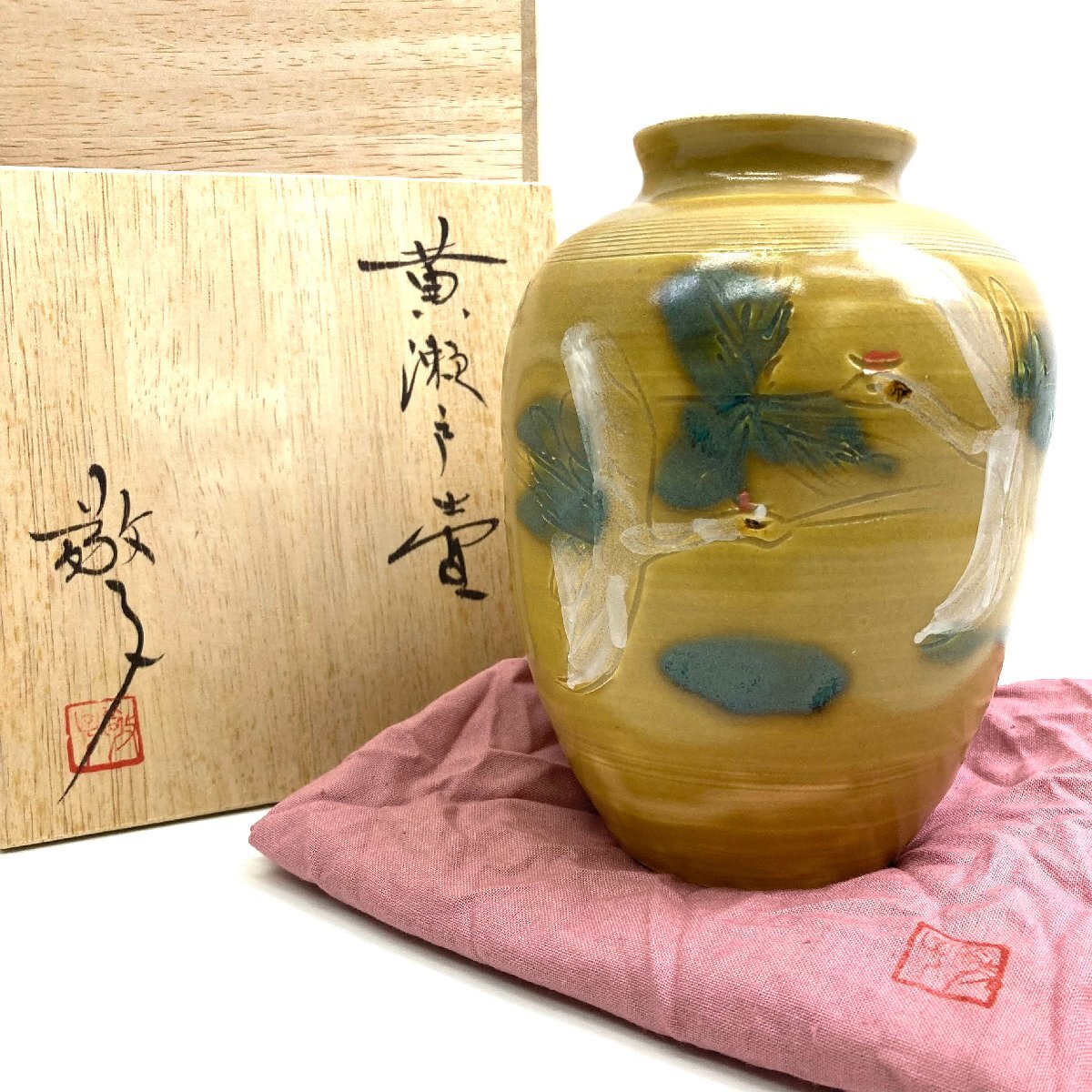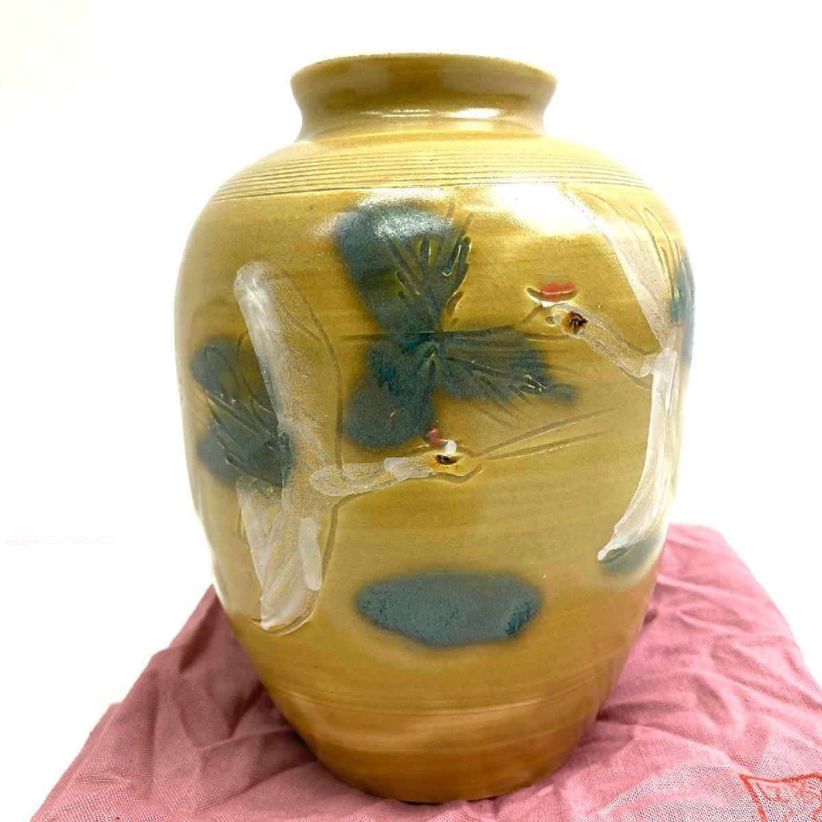 商品名 | e) 水野敬子造 黄瀬戸壺 鶴二羽 美濃焼 陶芸 工芸品 陶磁器 共箱・共布・栞有り ※経年保管品 |