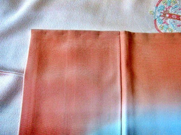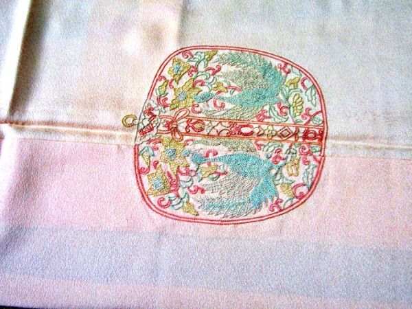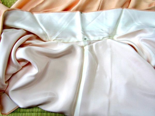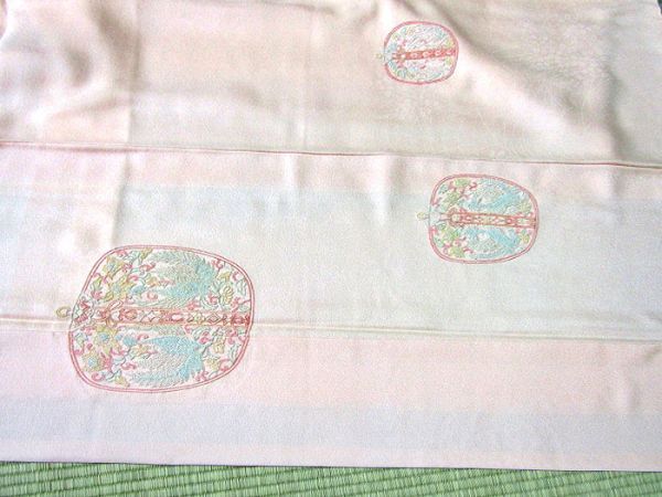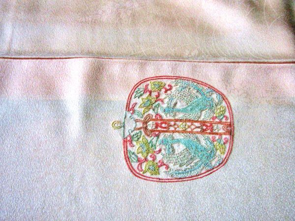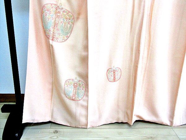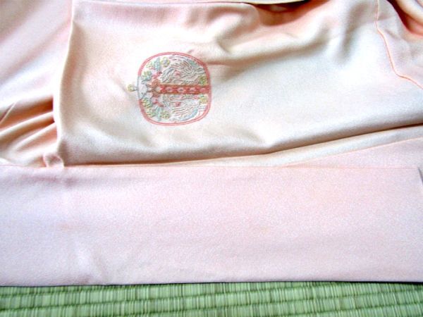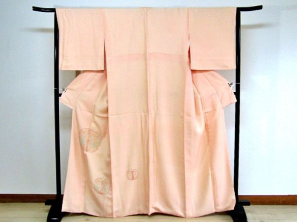 サーモンピンク地、棗模様の相良刺繍附下きものです。