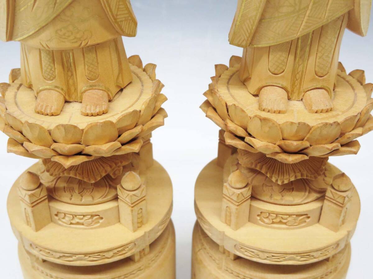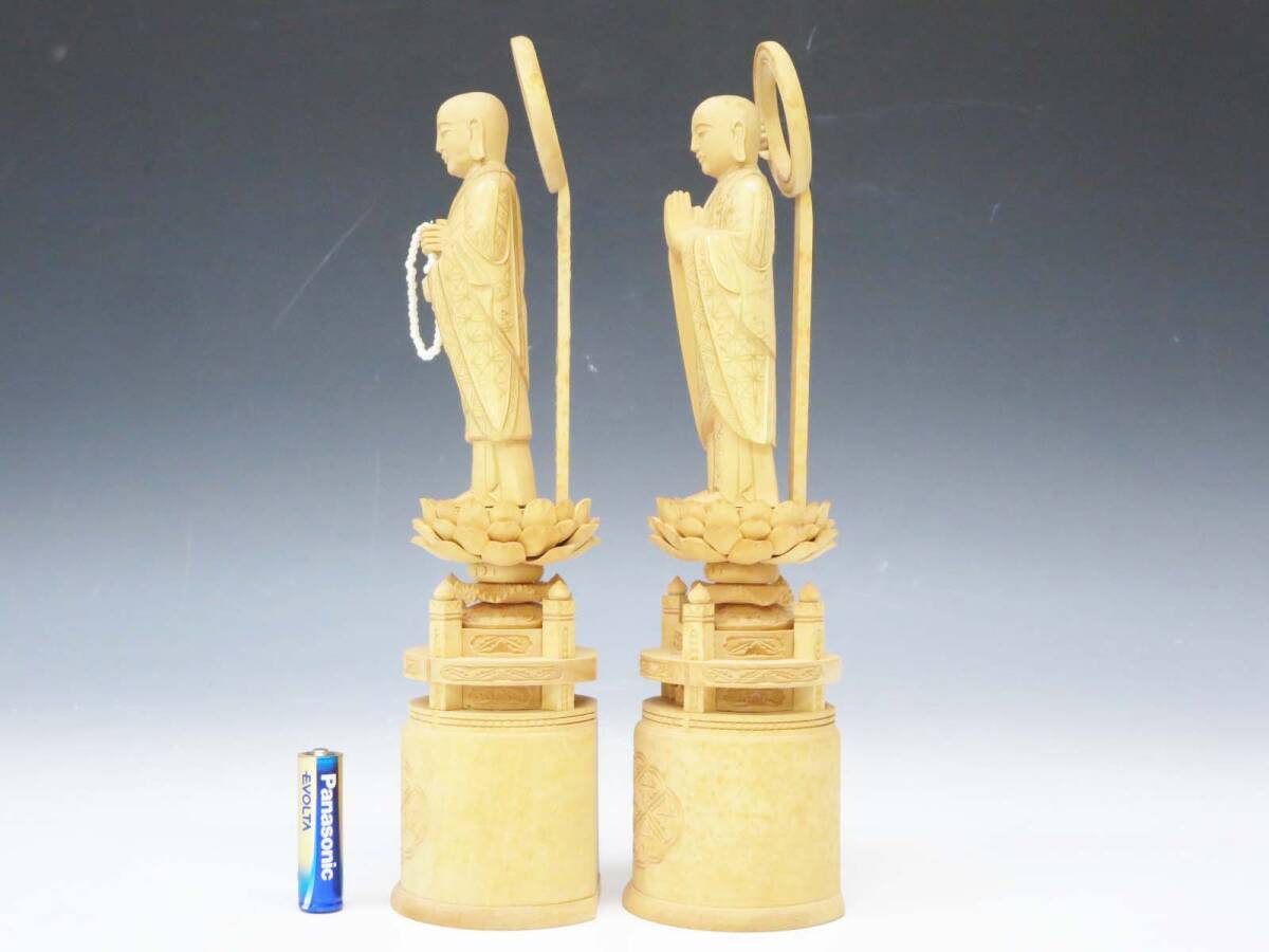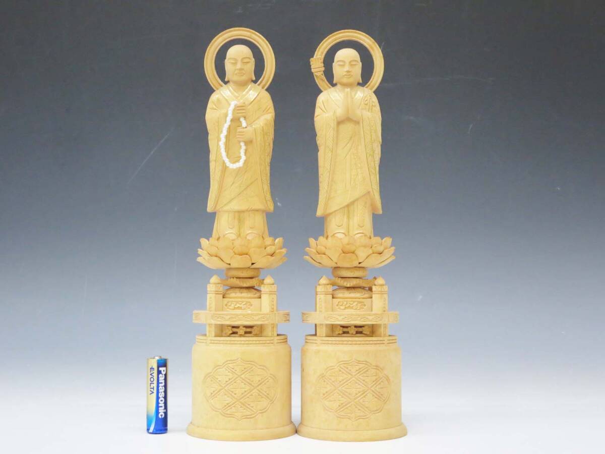 ◆(EG) 木製 木彫り 彫刻 浄土宗 両大師 法然上人 善導大師 仏像 2体セット 工芸品 総柘植? 金泥? 六角台座 脇侍 立像 仏教美術 仏壇 仏具