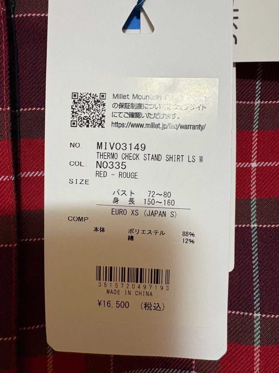 MILLET ミレー サーモ チェック スタンド シャツ ロングスリーブ MIV03149 レッド-ローグ Sサイズ 未使用 レディース ネルシャツ 登山