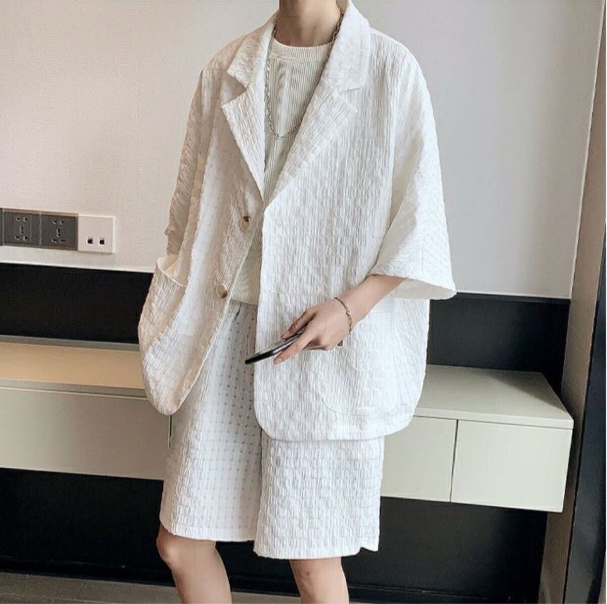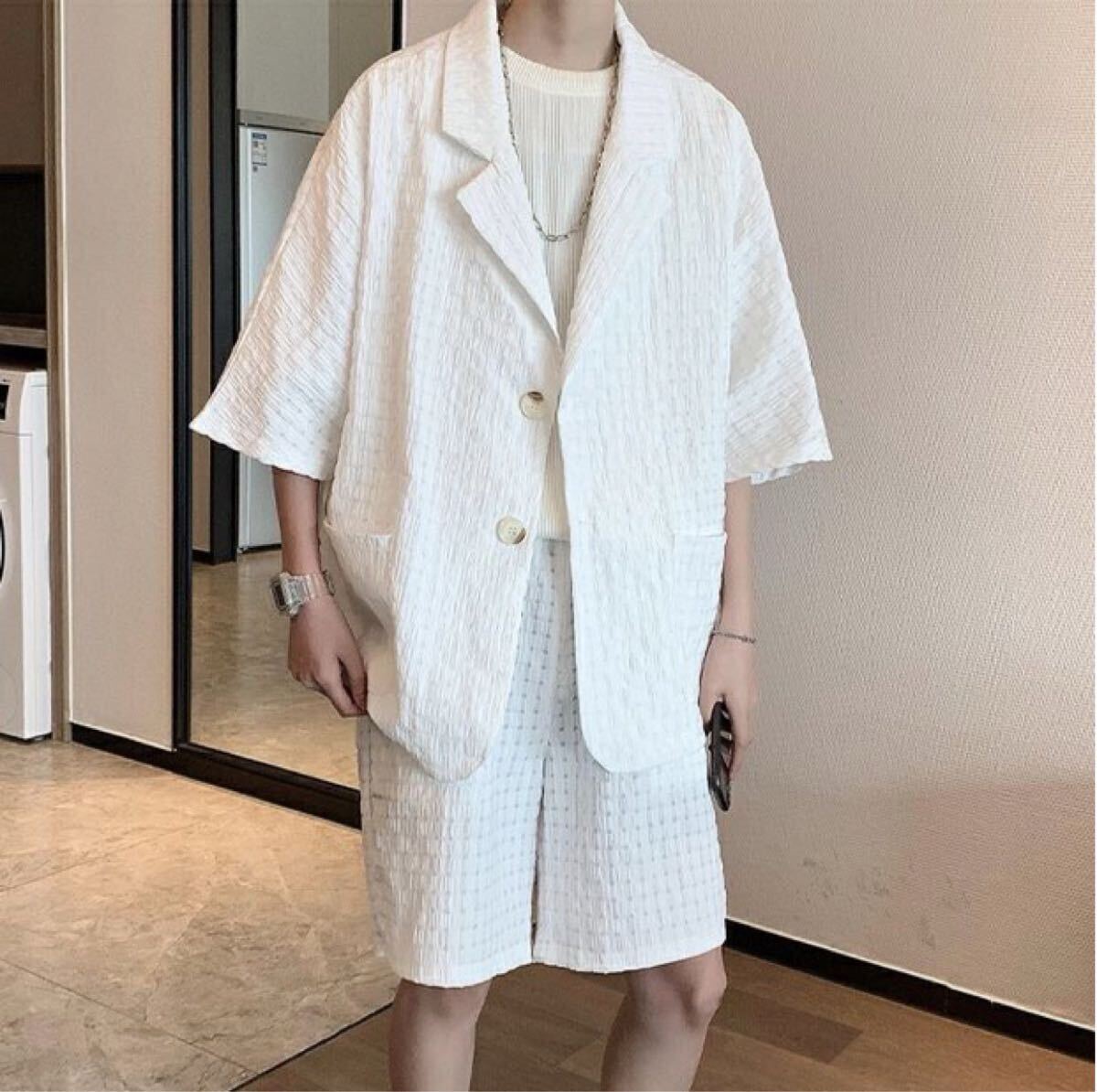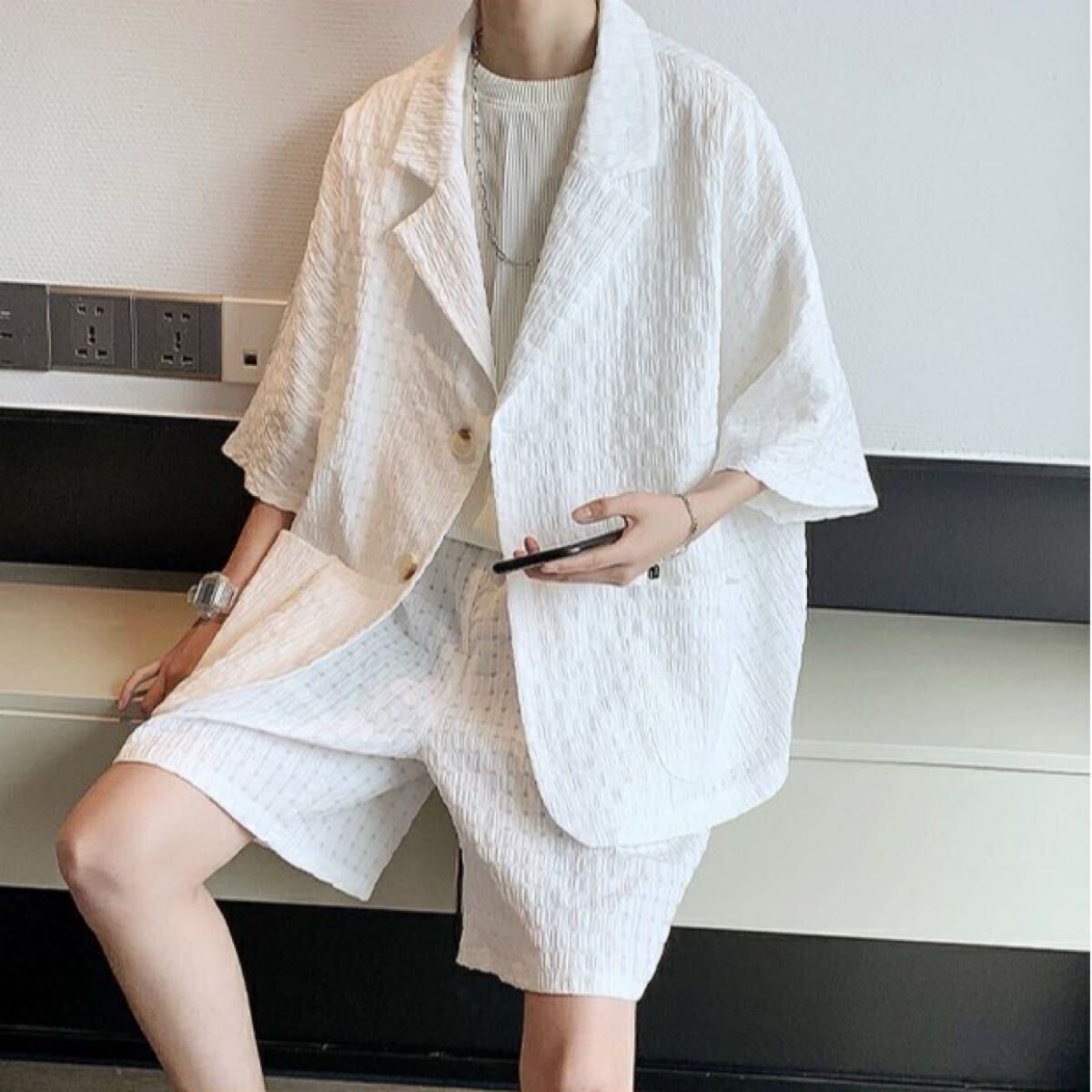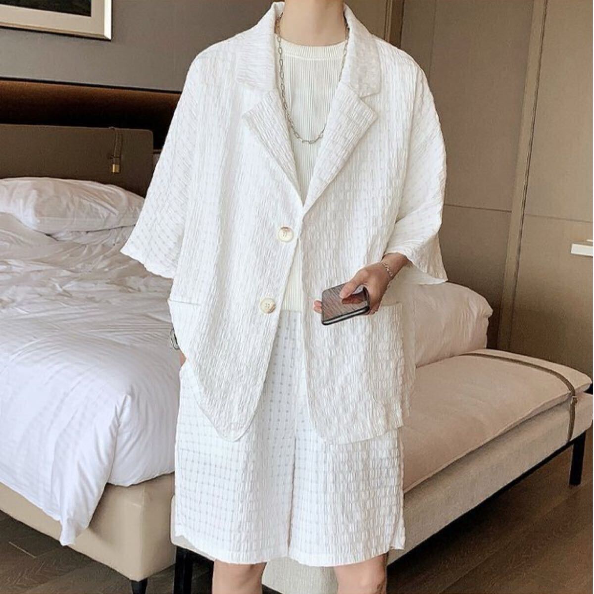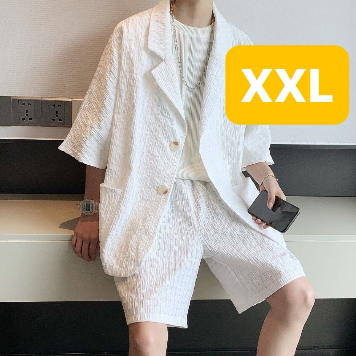 セットアップ ジャケット パンツ 2点セット 部屋着 ワッフル ルームウェア ジャケパン 上下セット ショートパンツ トレンド 白 XXL
