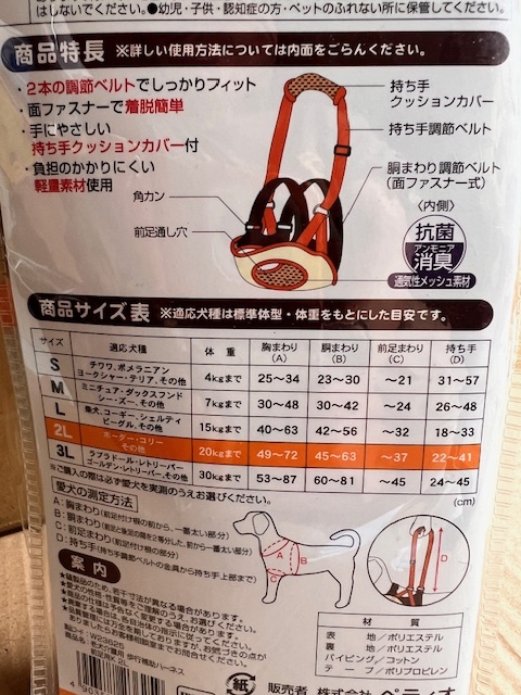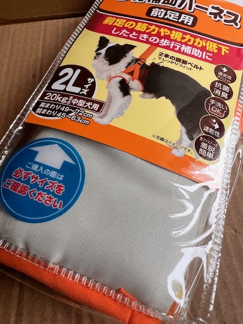 | * 商品説明 * ◆定価5038円の商品 シニア期~介護期の愛犬をやさしくケア。 前足の筋力や視力が低下したときの歩行を助ける、胸元をしっかり支えるハーネスです。 前足を通して、2本の調節ベルトで体にフィットさせます。 内側にメッシュ素材を使った軽量素材で、通気性に配慮。 飼い主の手にもやさしい持ち手クッションカバー付きです。 2Lサイズ 体重20kgまで 胸回り49~72㎝ 胴回り45~63㎝ 前足まわり~37㎝ 持ち手長さ22~41㎝ ※商品重量約160g 未使用新品ですが紙パッケージに色褪せがある場合があります。処分品とご理解の上ノークレームノーリターンでお願いします。 | ||||||||
