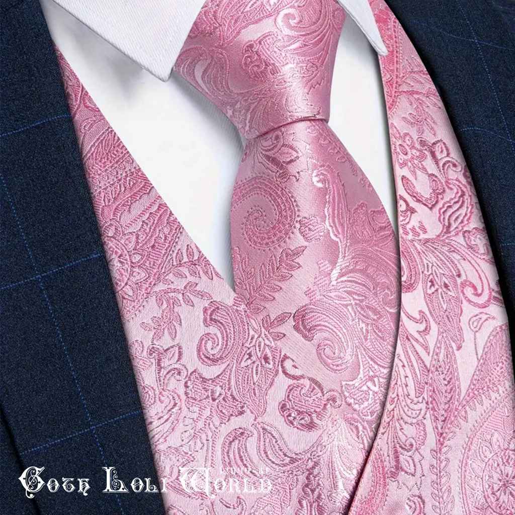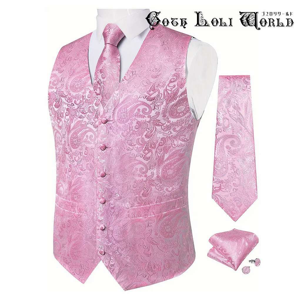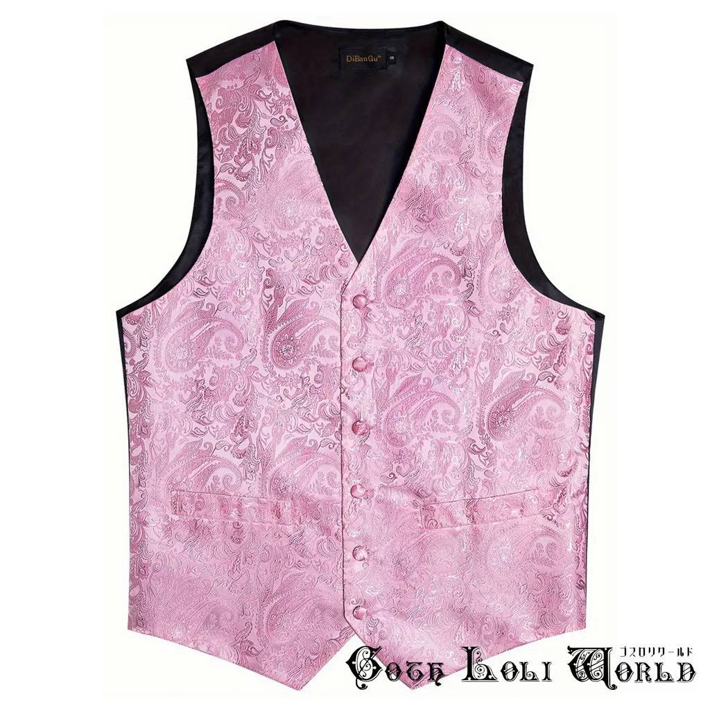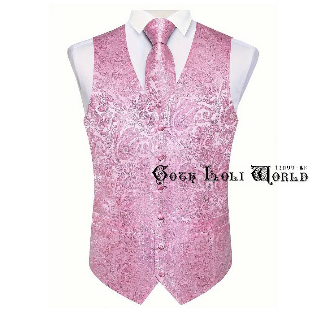 即納 WT012CE-M ベスト ネックタイ ハンカチ カフスボタン セット ピンク色 メンズファッション ジェントルマン 紳士 ジャガード ゴシック