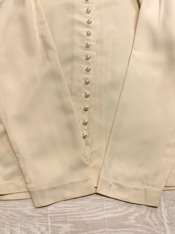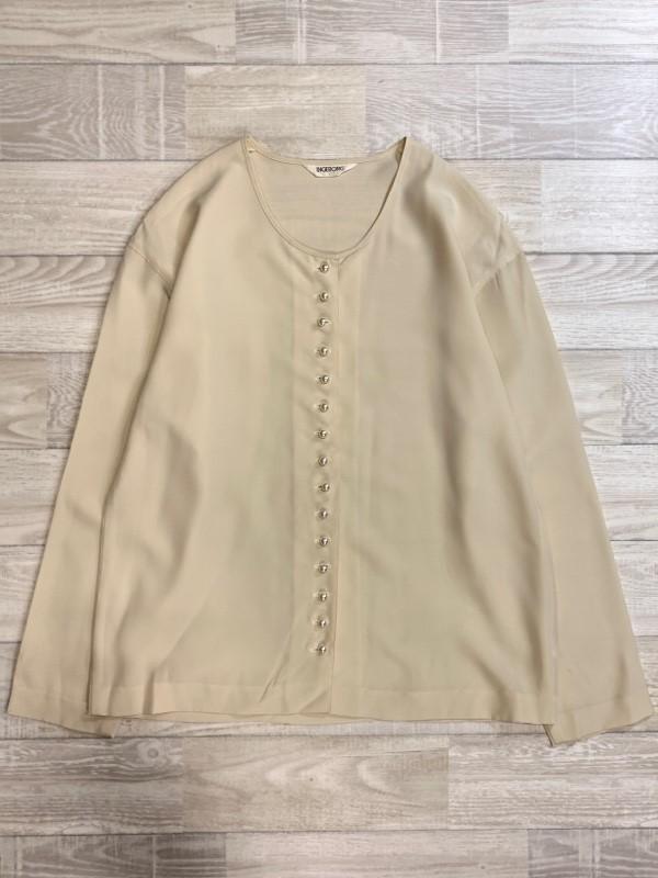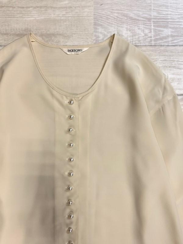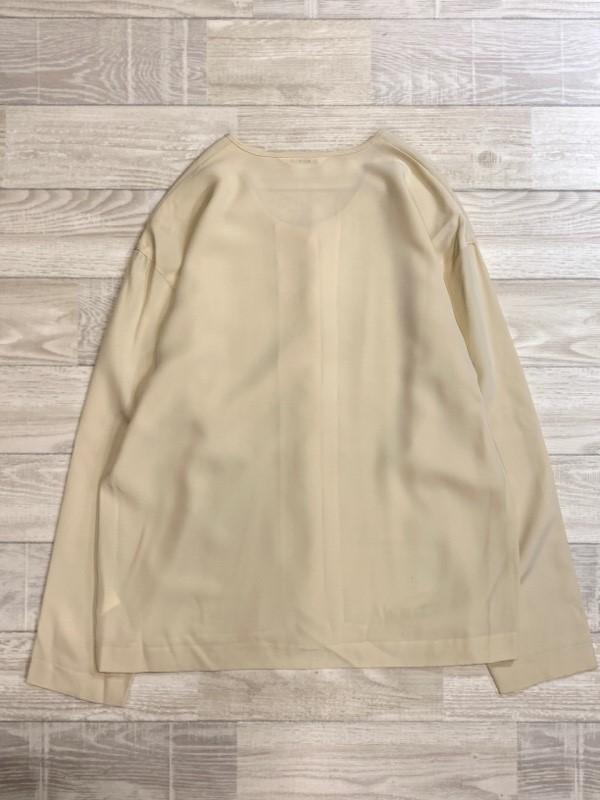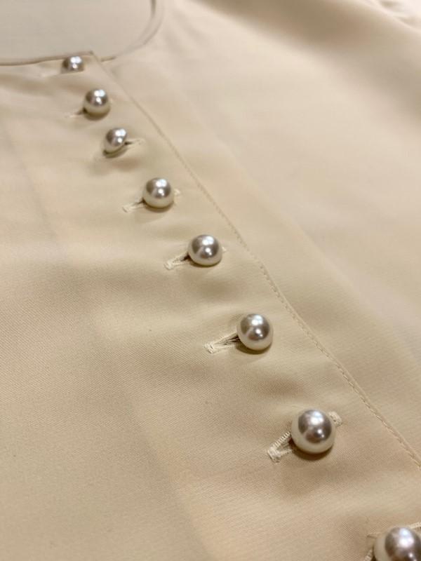 | 【アイテム】 | パール調ボタンとろみ素材ノーカラーブラウス |