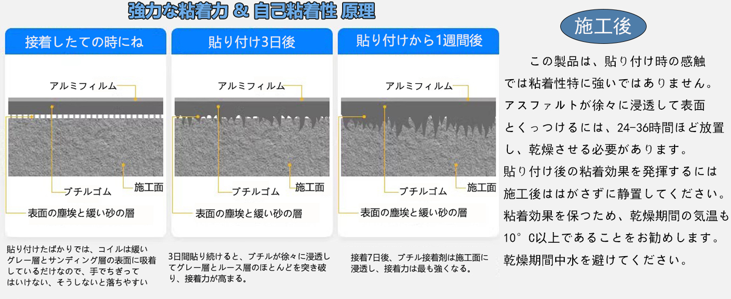 【強い粘着力】接着面は強力な接着力素材を使用し、耐久性も優れていて、長期間使用でも防水性能を保てます。 【強力防水】良質なアルミニウム箔材料、防水性、漏れ防止性、断熱性に優れている。 【高温・低温耐性】高温に耐性があり、長時間の日光に当てても問題ない、低温耐