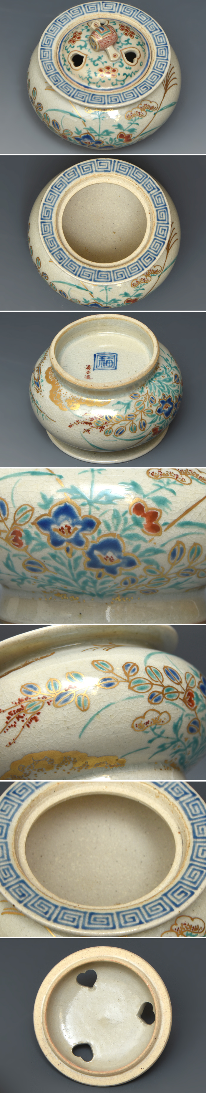 | 明治期 九谷焼 宮川英吉(造)仁清意金彩色絵秋草文香炉 共蓋 摘み小槌 桐箱 香道具 茶道具 美品 古陶磁器 |