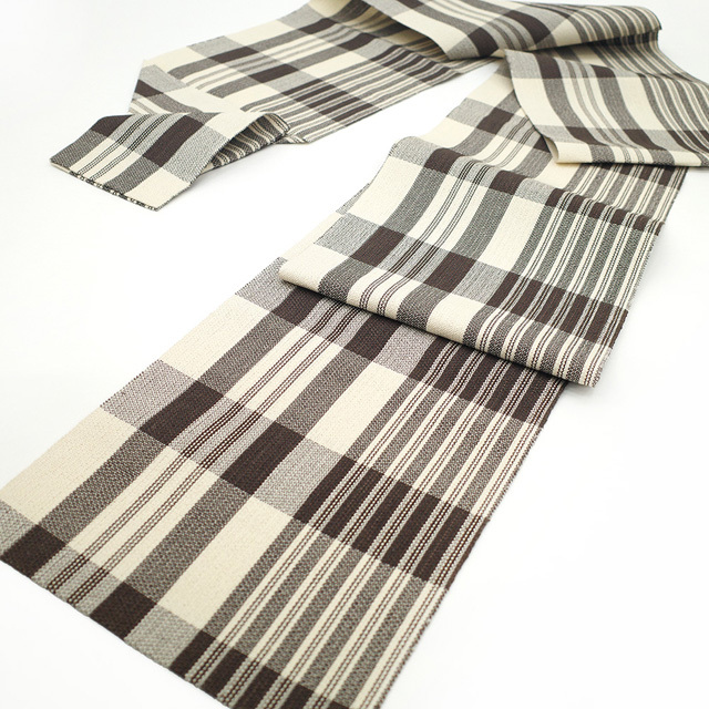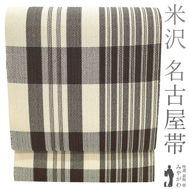 名古屋帯 未使用 正絹 米沢 米澤 正絹 八寸 全通 アイボリー こげ茶 チェック 格子 カジュアル 新古品 仕立て上がり みやがわ sb53924