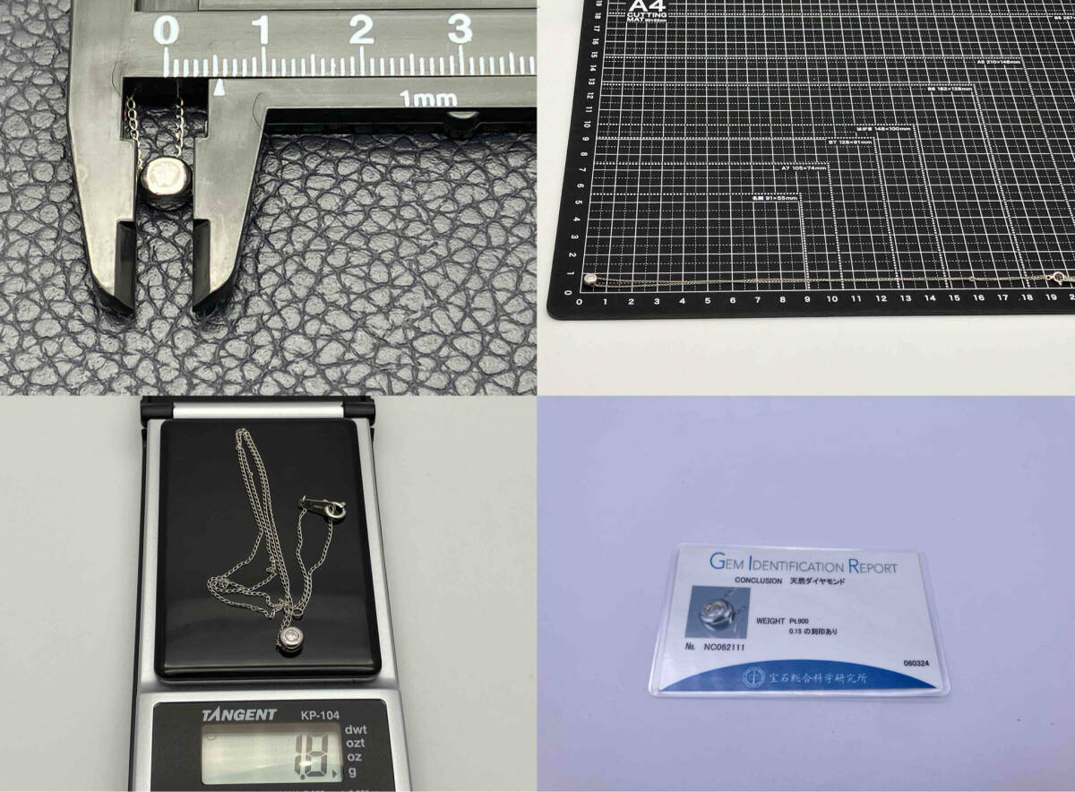 カラット数:0.15ct チェーン全長:約 40cm 高さ:約 0.6cm 幅:約 0.6cm 総重量:約 1.8g サイズ表記(~cm位)は目安です。ブランドやデザインによって多少前後する場合がございます。予めご了承の上ご注文ください。 ![]() | ||||||