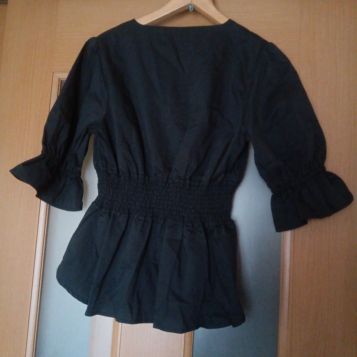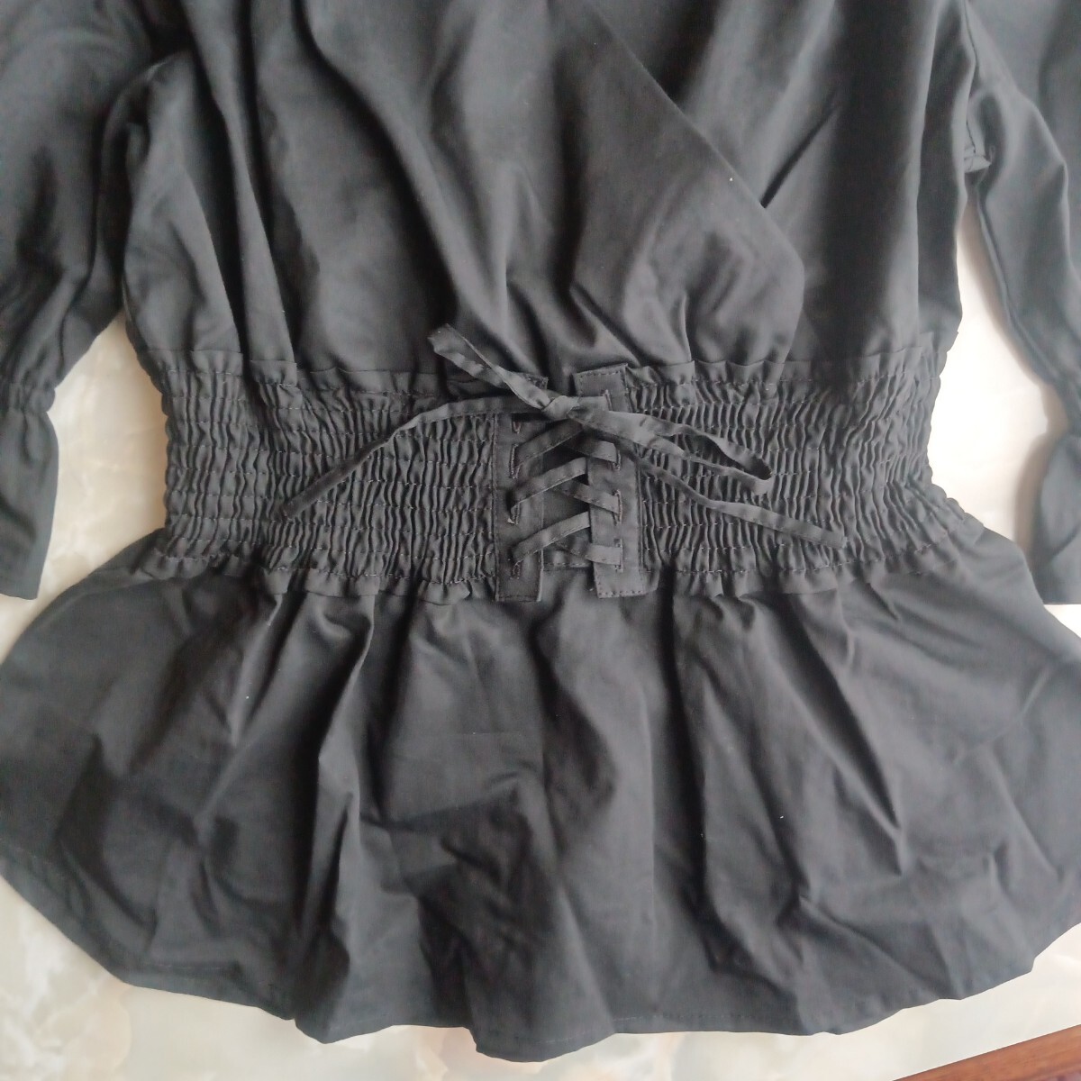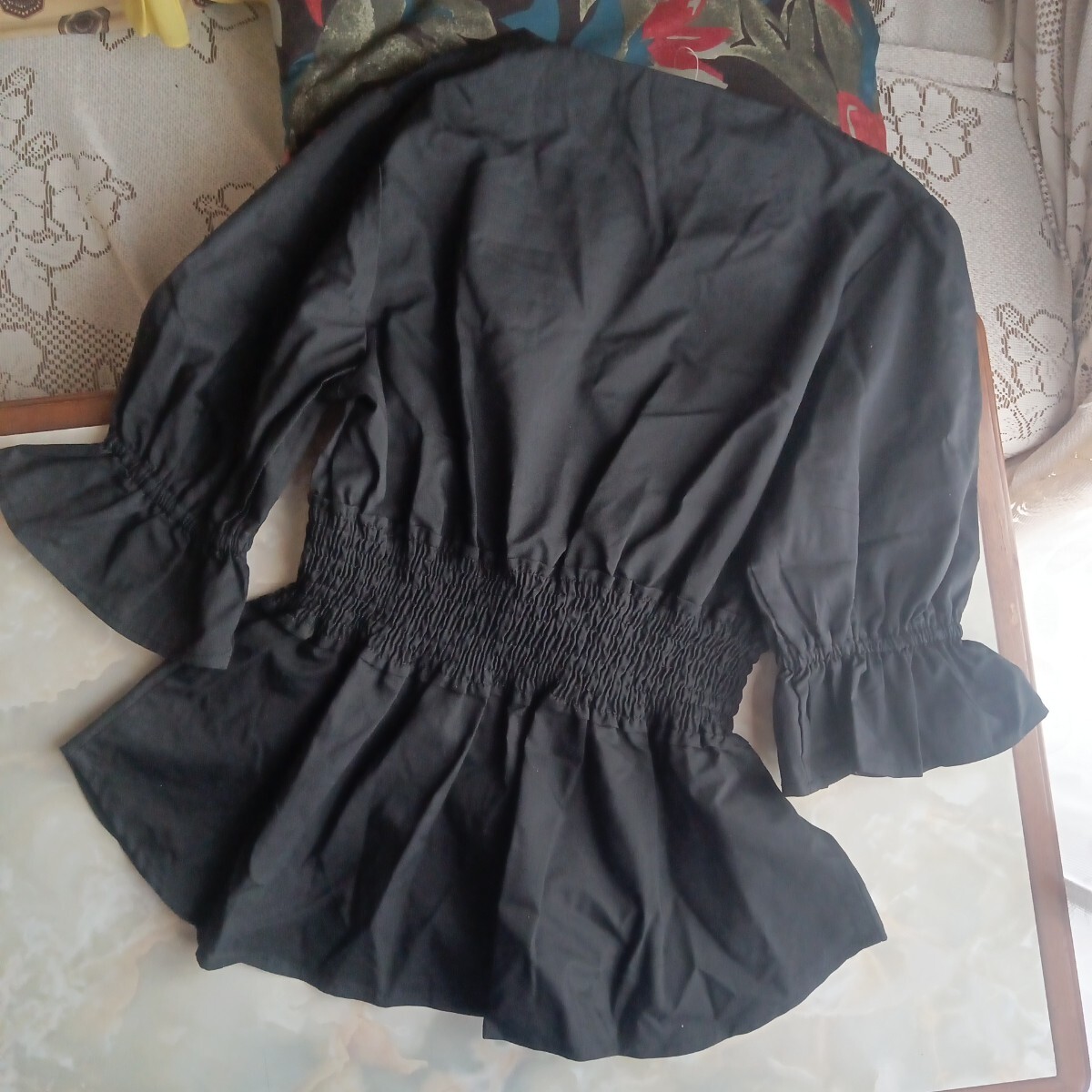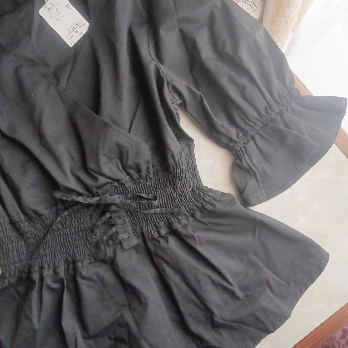 袖元はフリルになっていて腕の細見え効果や、