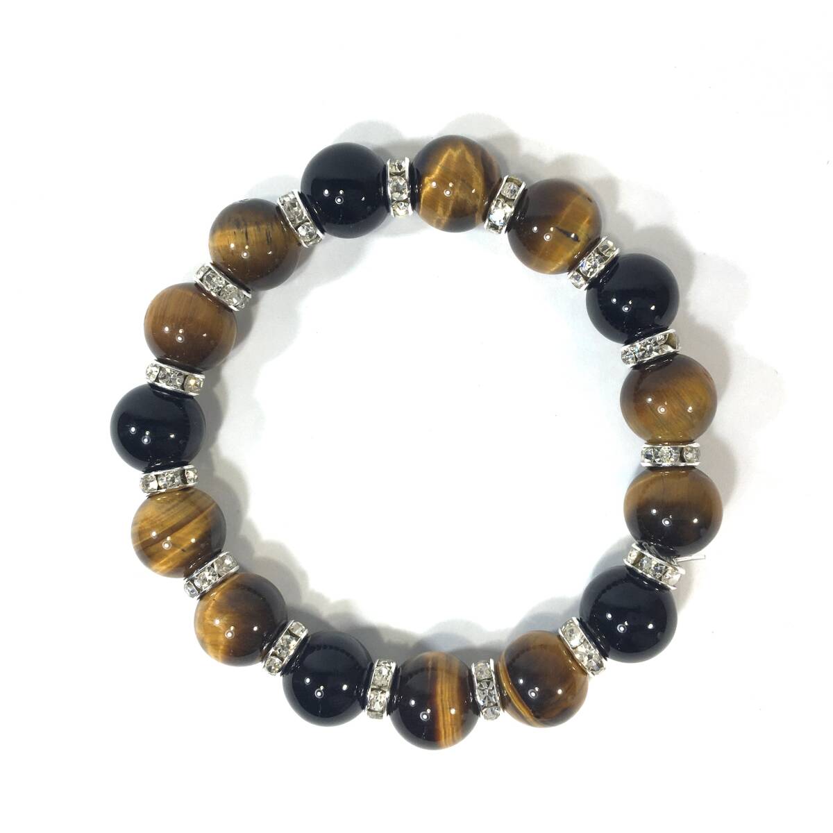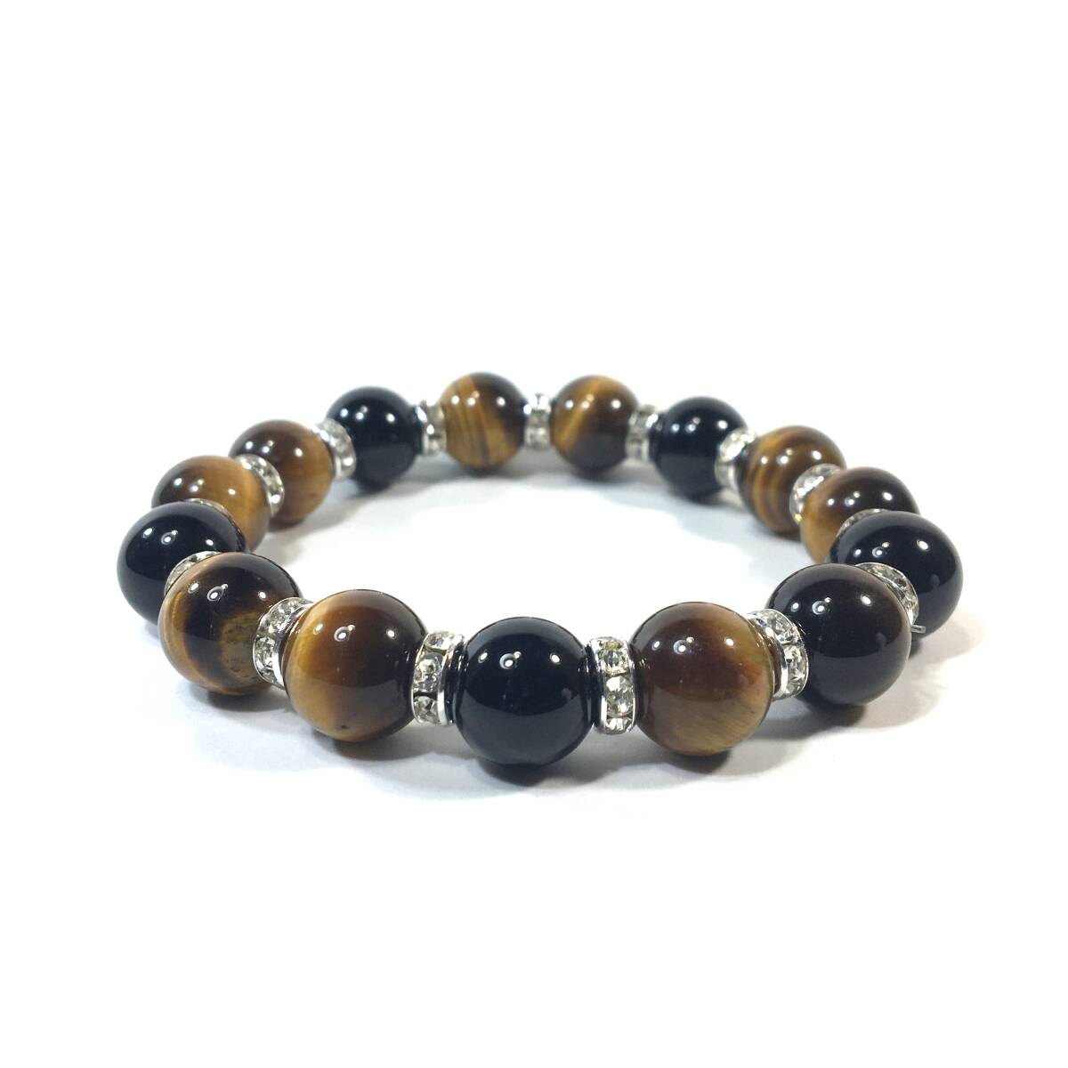 こちらは、タイガーアイとオニキスを組み合わせたパワーストーンブレスレットです。間にはロンデルを挟み高級感あるデザインに仕上げております。石大きさは12mm玉を使用して内径約18cmです。気になる方は是非この機会にどうぞ。