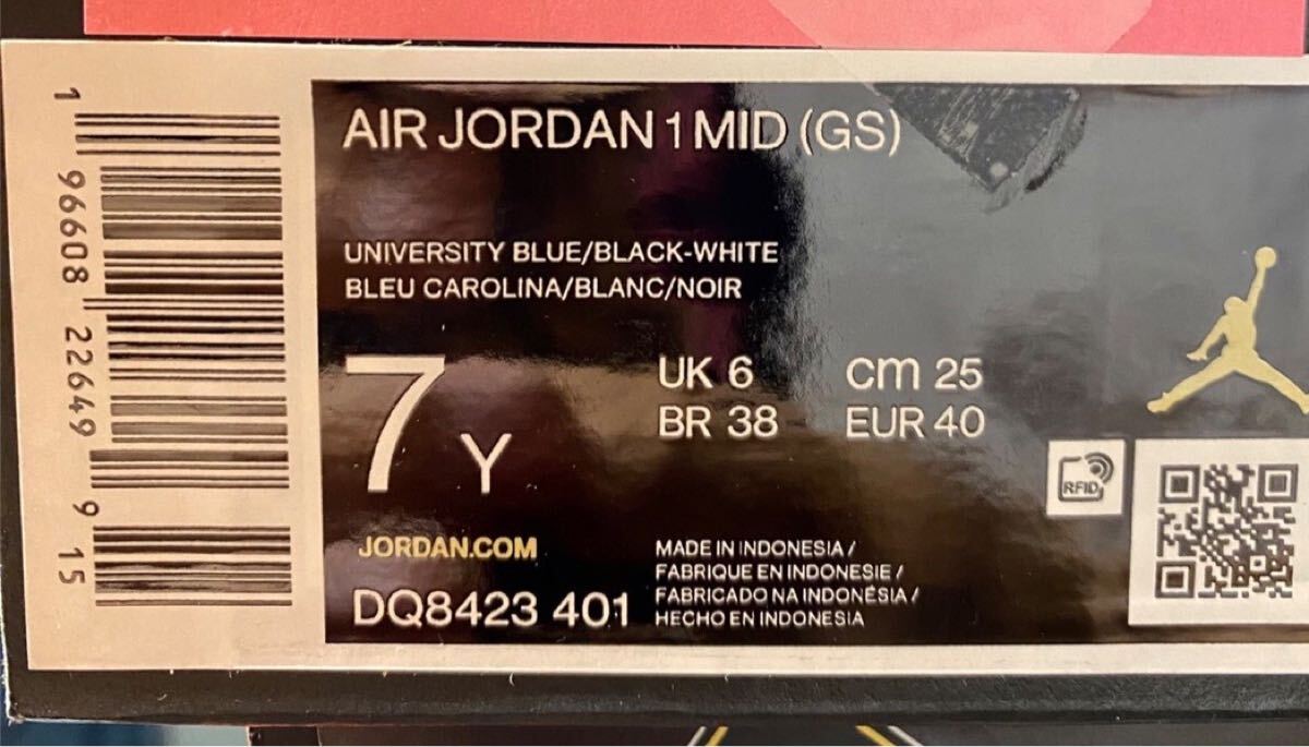 ナイキ GS エアジョーダン1 ミッド "ユニバーシティブルー"(DQ8423-401)青25cm箱無し