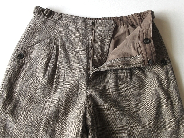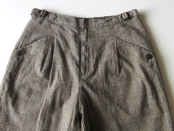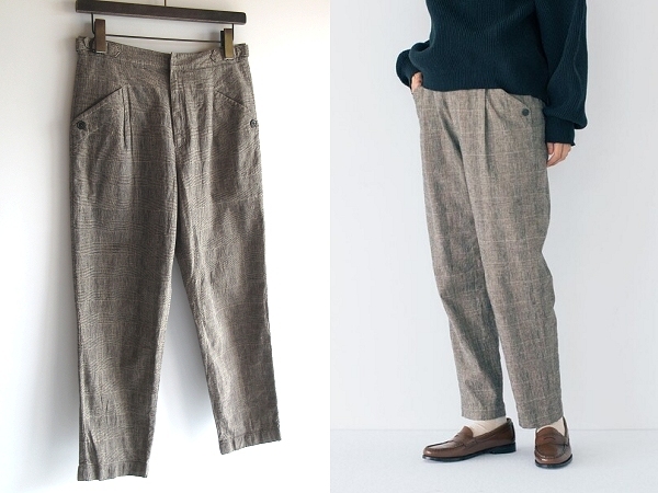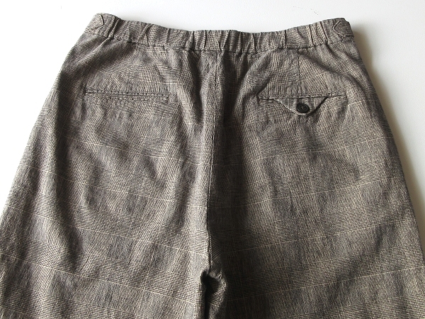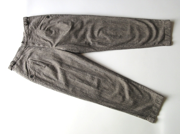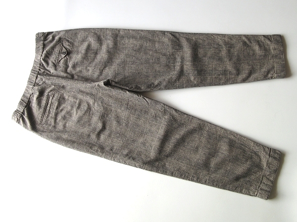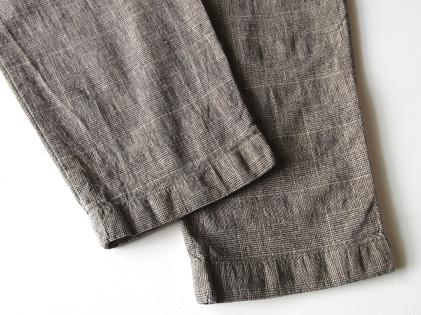 KURASHI&Trips PUBLISHINGのパンツ。グレンチェックのコットンリネン生地を使用しております。太ももや腰回りにはゆったりと余裕を持たせ、締め付けのない動きやすいつくりに。一方で、ルーズすぎる印象にならないよう、裾に向かって少し絞ることで上品さを加えています。上質な素材使いと綺麗なシルエットで、様々なコーディネートにお使い頂ける一着です。