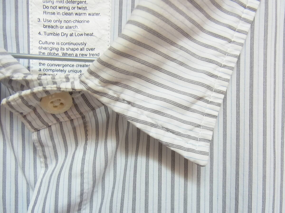 色は白地にグレー×ブラックのストライプで、素材は高密度で微光沢のあるシャツ地のコットンブロードクロスを使用しています。