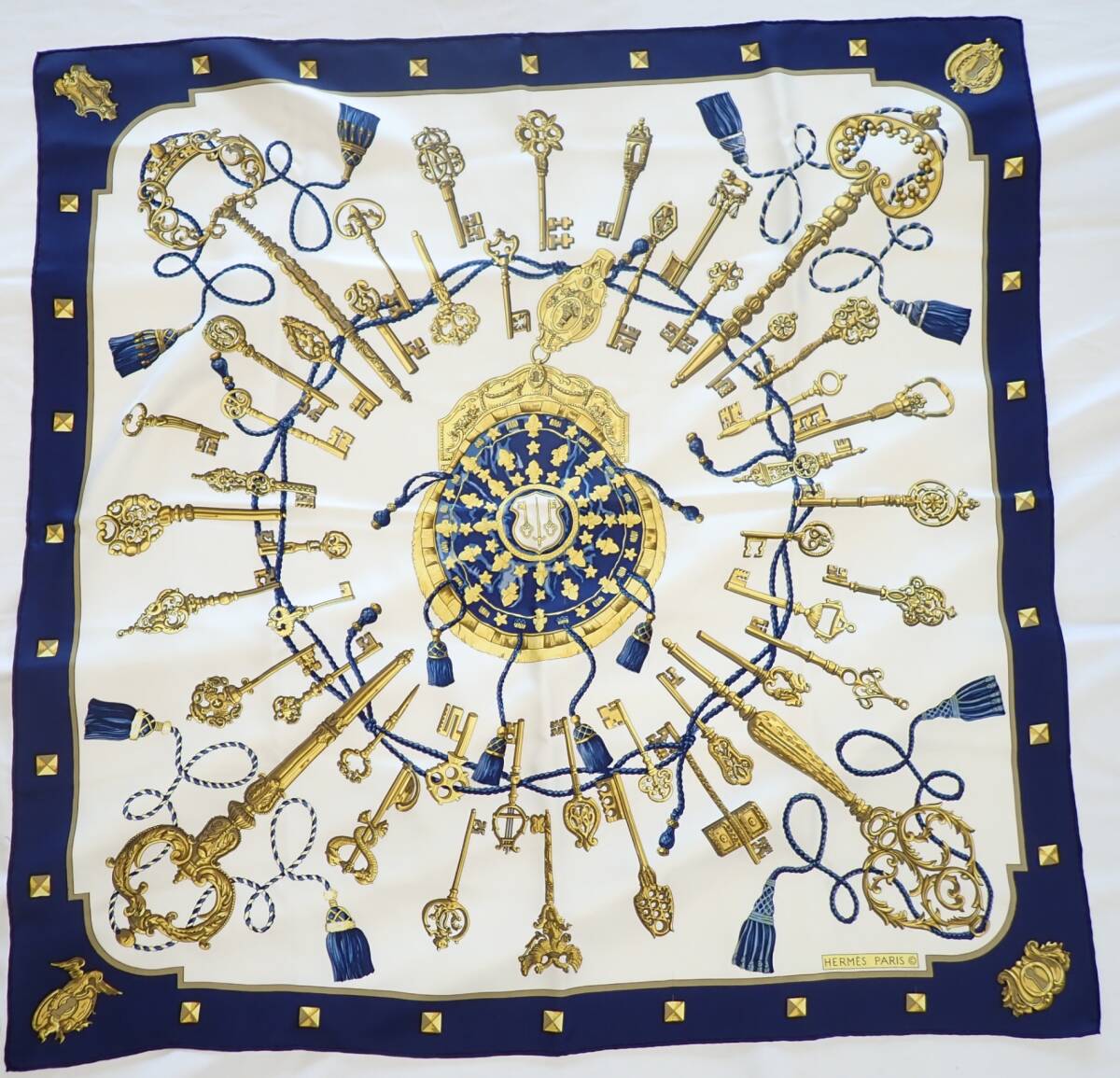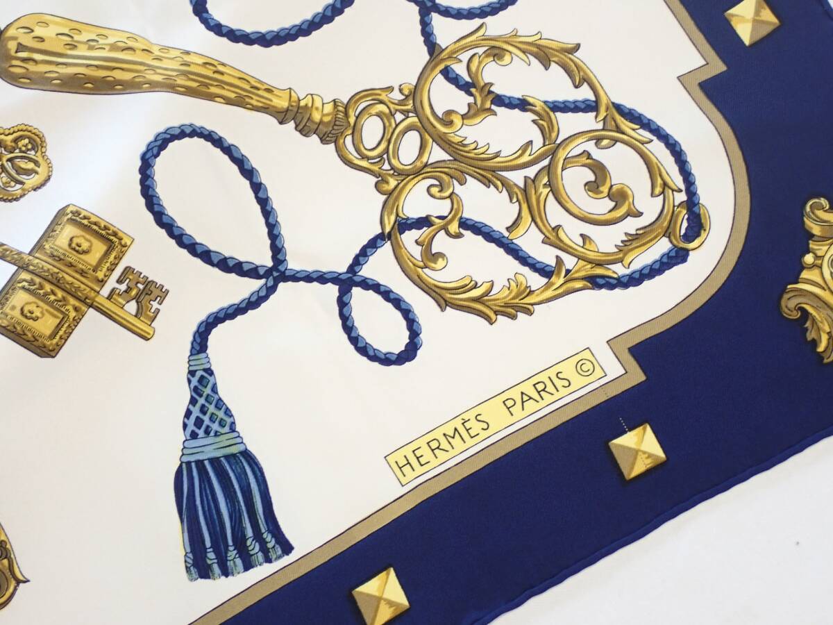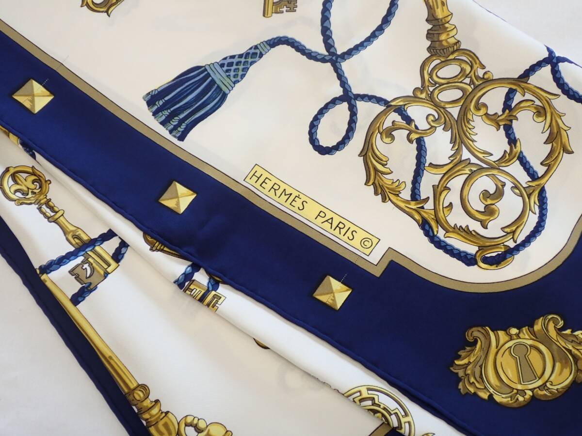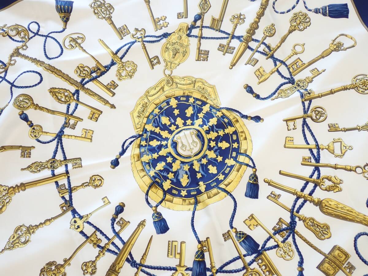 コメント | ホワイト×ネイビー系の柄です。サイズ88㎝×88㎝目立つ汚れや擦れはございません。※タグは付いておりません。 |