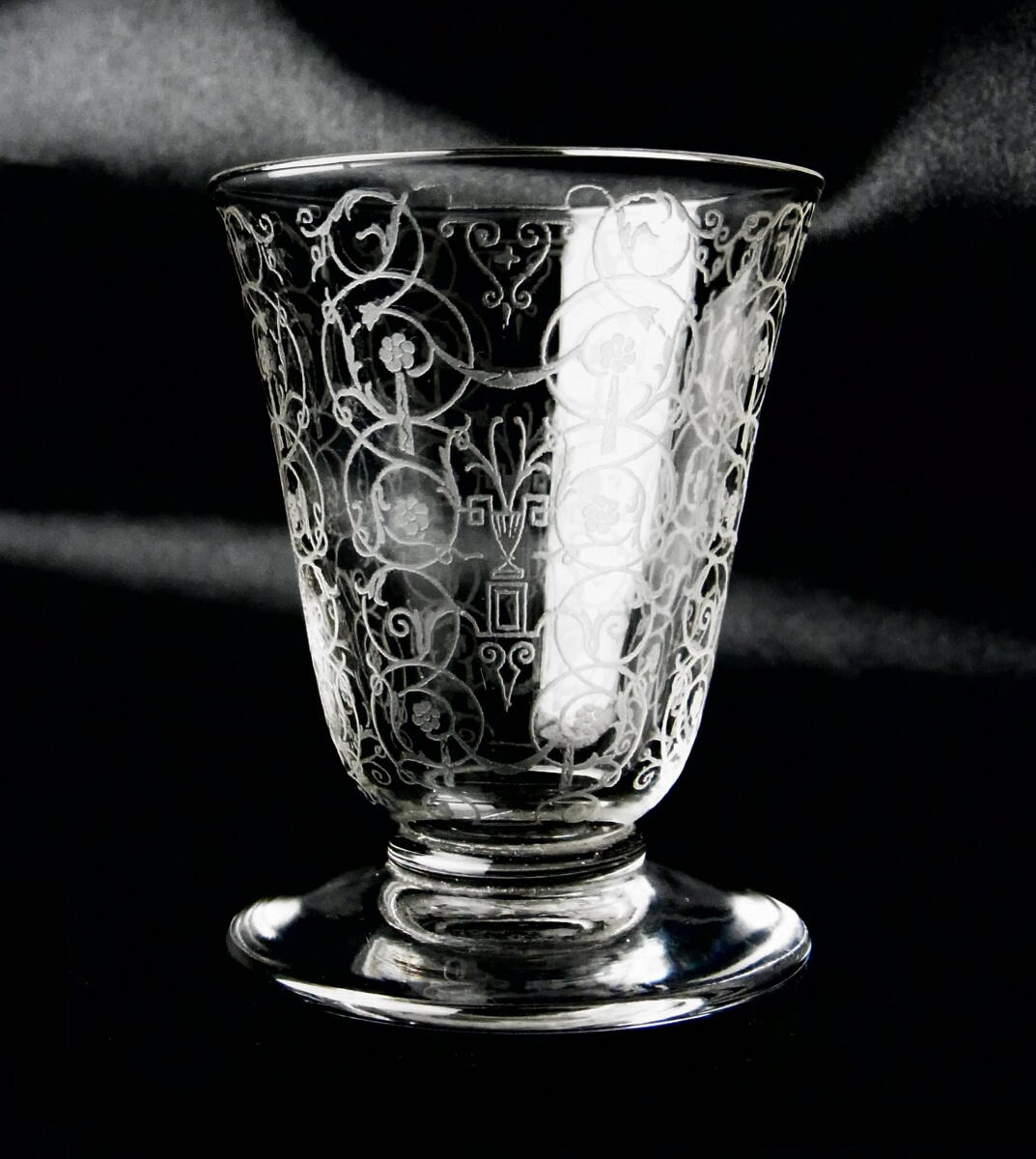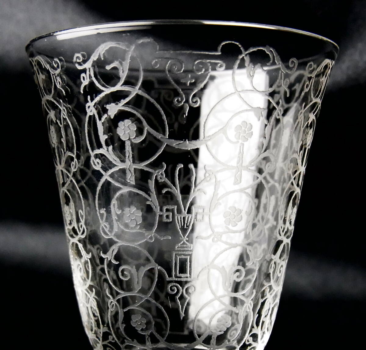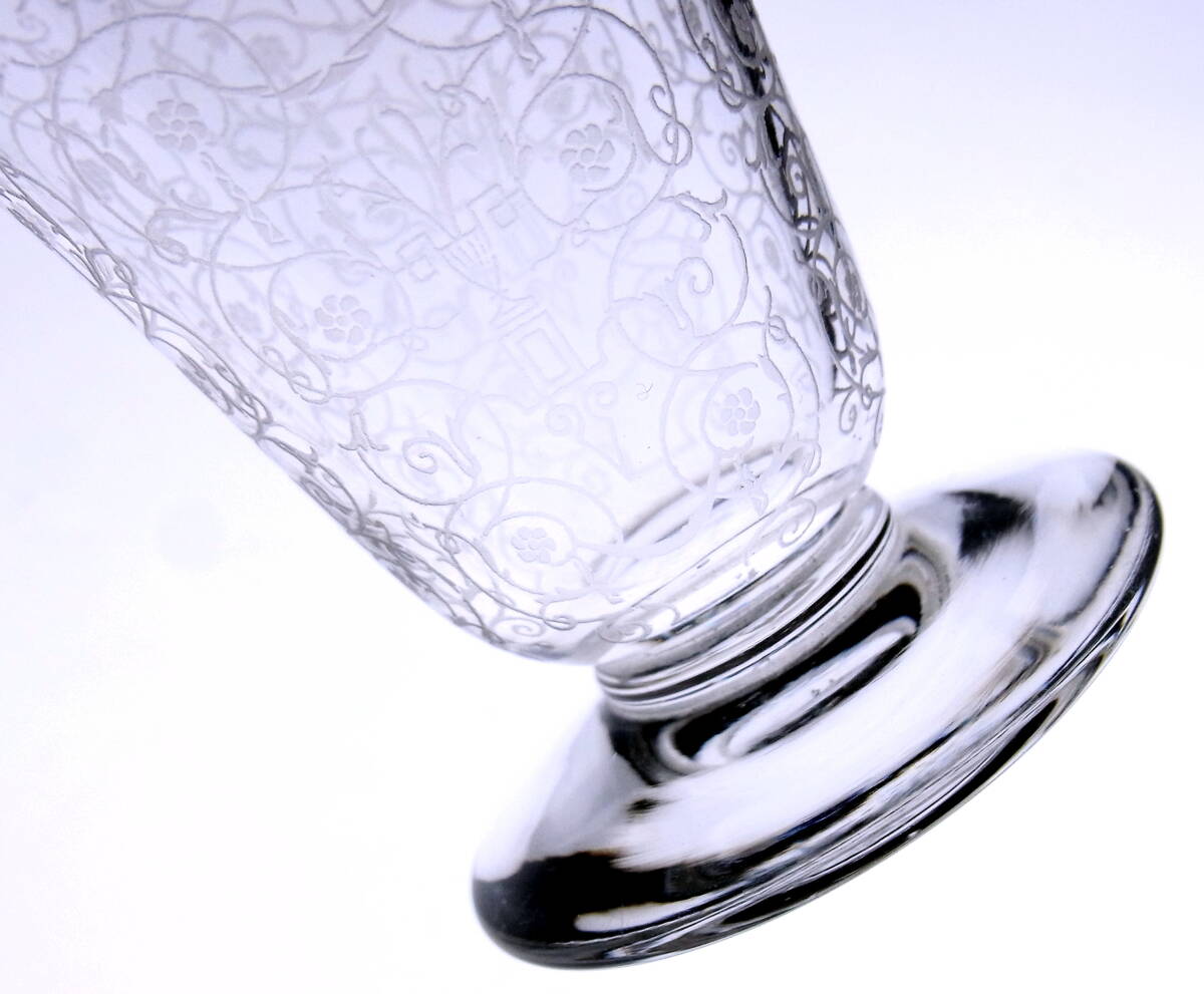小さなボウル部に、繊細なエッチングで可憐なアラベスク模様が丁寧に描かれています。
