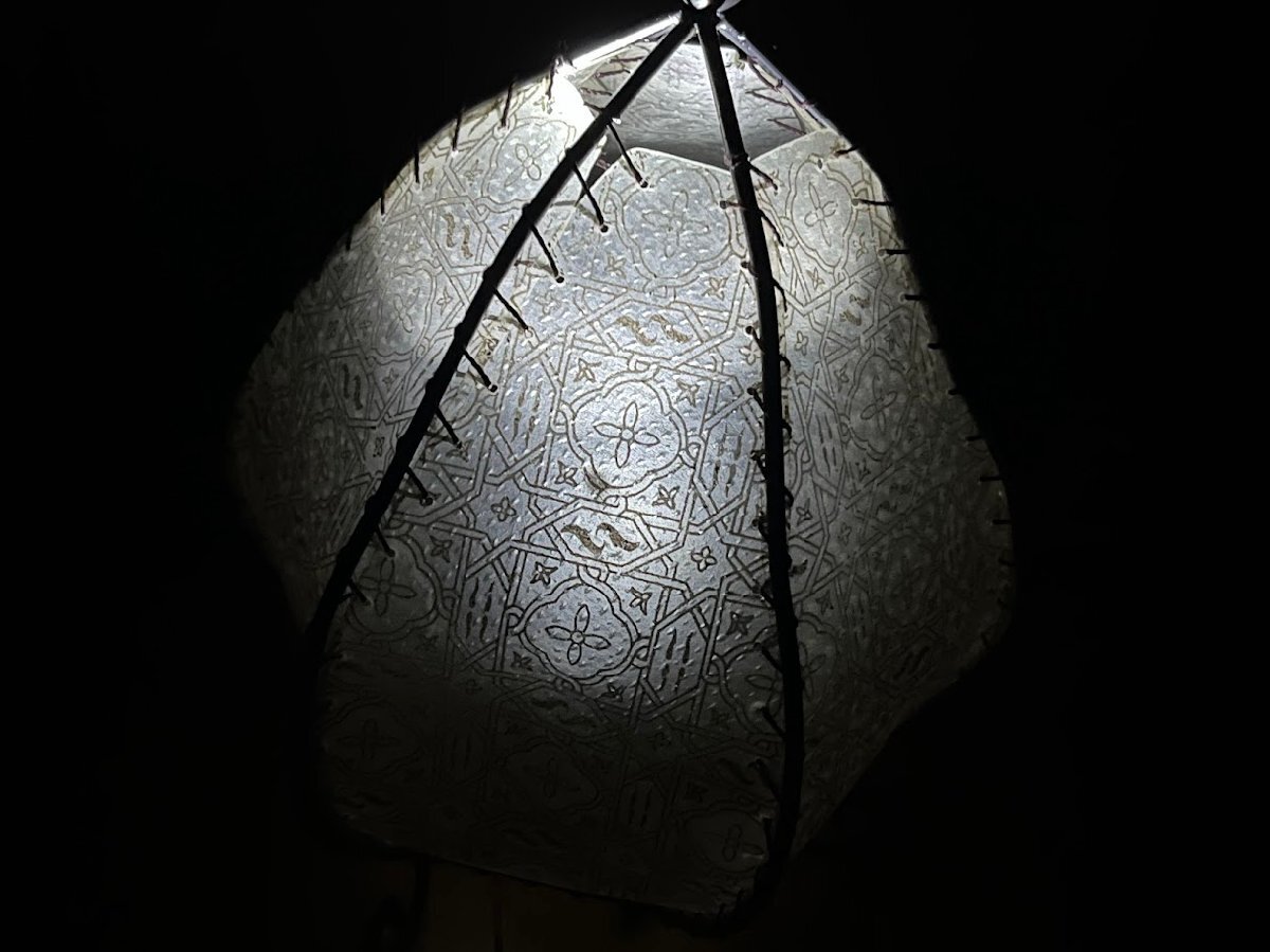 キャンドル用の傘は骨組みはスチールにビニールカバー、半透明の部分は硬い油紙のような感じの材質です。高さ23cm。