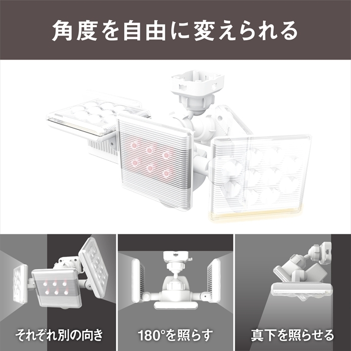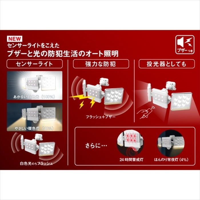 高機能+防犯対策向きのコンセント式センサーライト。 センサーライトを超えたブザーと光の防犯生活のオート照明。 フリーアーム式で圧倒的な自由度を実現します。 |