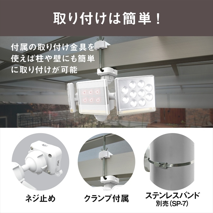 ・ 電源/電圧:AC100V電源、50/60Hz ・ 消費電力: ・点灯時:25W(全灯)、17W(暖色灯)、1.8W(常夜灯) ・待機時:1W以下 ・ 電球種類:12W×2高輝度LED (設計寿命4万時間)(※1) ・ 全光束:約2200ルーメン(全灯)880ルーメン(電球色) ・ 探知方式:焦電型赤外線センサー ・ 探知範囲:180°最遠12m、※取付高さ2.5m ・ 点灯時間設定:10秒/30秒/5分/10秒フラッシュ ・ ブザー音量: 50dB ・ 点灯切替え機能: ・昼:周囲が明るくても暗くても点灯 ・夕:周囲が薄暗くても暗くても点灯 ・夜:周囲が暗い時のみ点灯 ・ 電源コード長さ :3m ・ クランプ取り付けサイズ ・厚み:最小15mm~最大100mm ・パイプ径:/最小30mm~最大85mm |