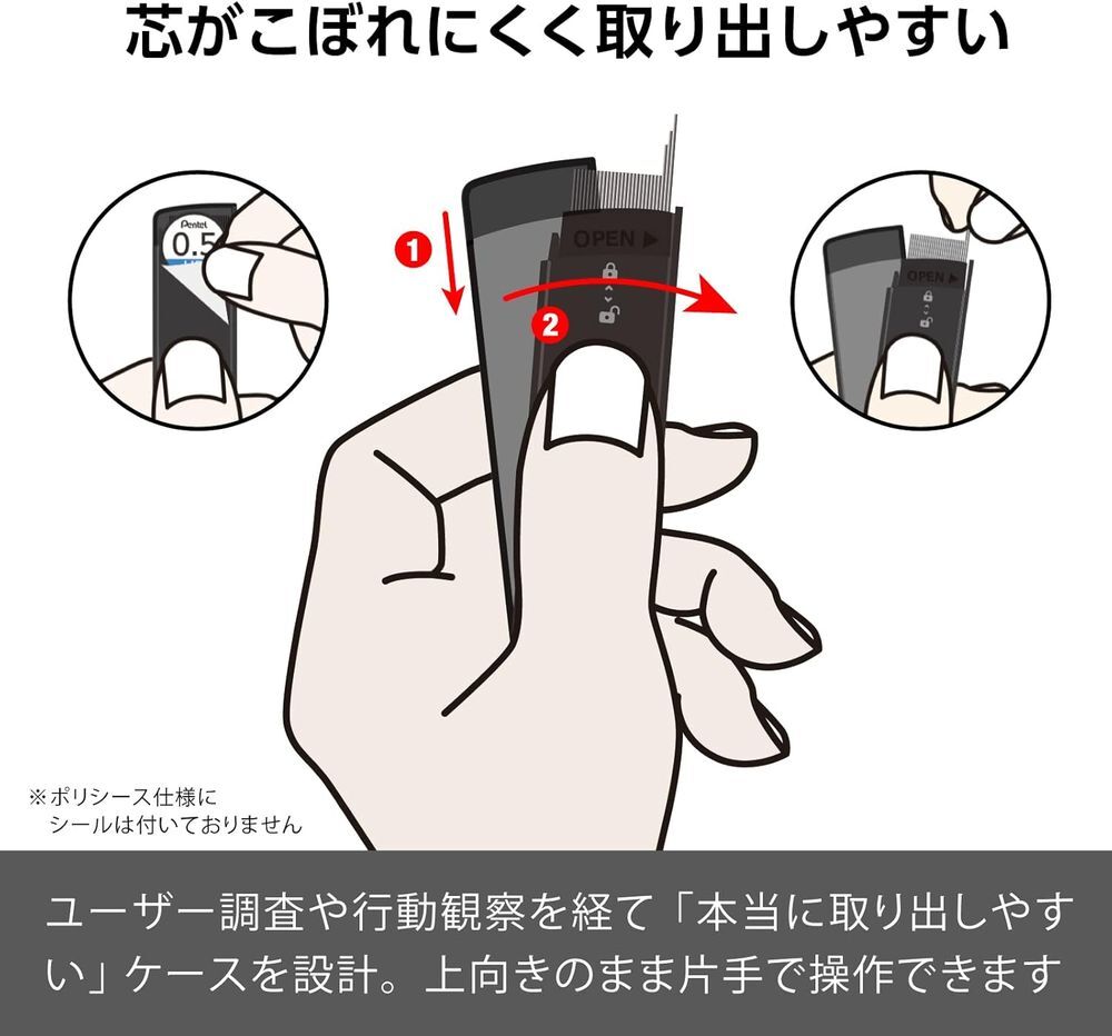 ケースを上向きのまま片手で操作できるから、芯をこぼすリスクを減らせます。