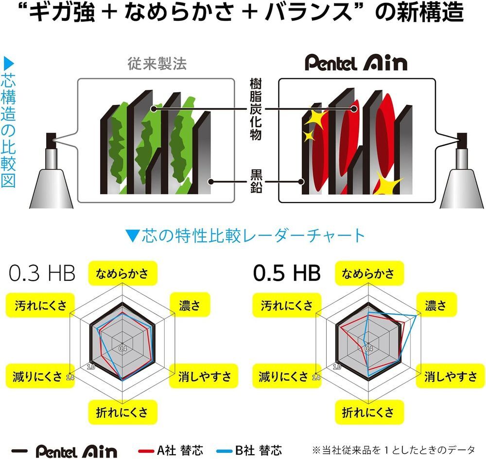 原材料に特殊なオイルを使用する新製法により、筆記時には黒鉛と樹脂炭化物がなめらかに崩れるため、なめらかな筆記感を実現しています。