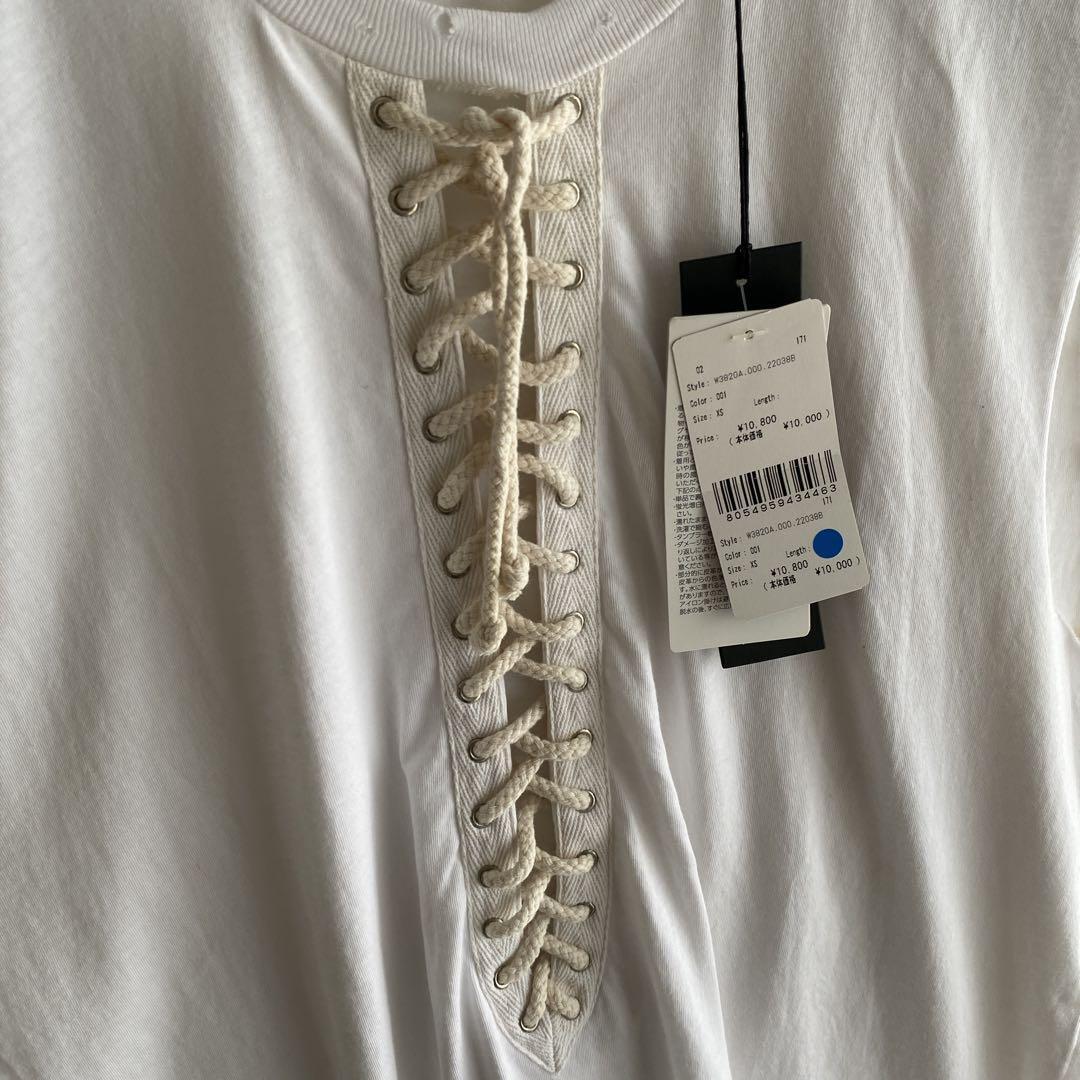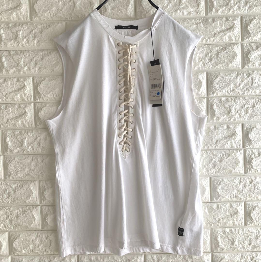 ホワイトのレースアップノースリーブトップス、コットン素材で快適な着心地。