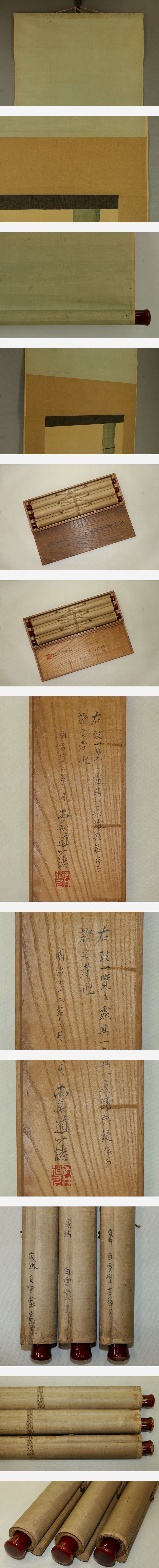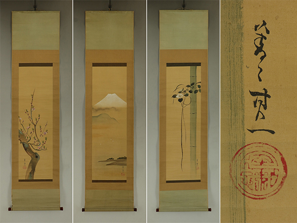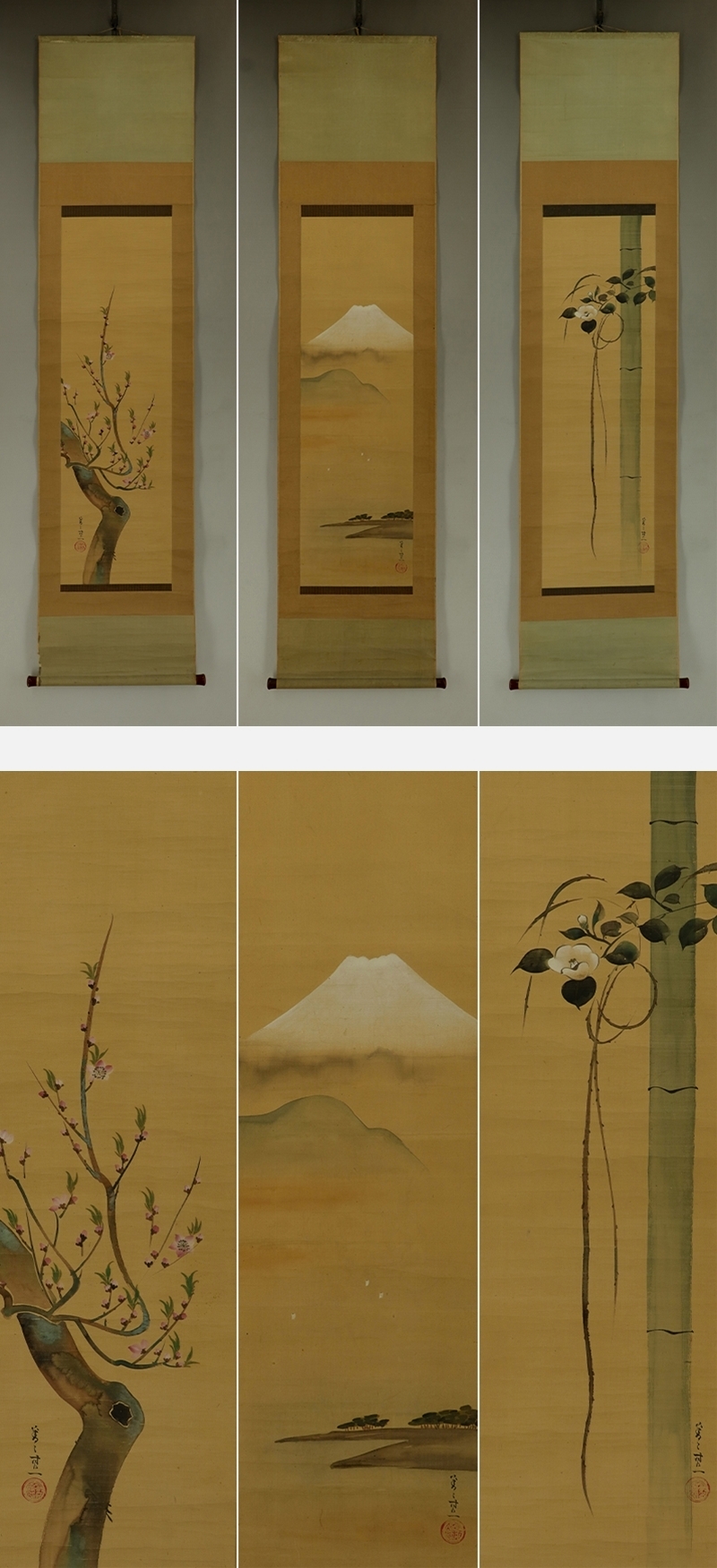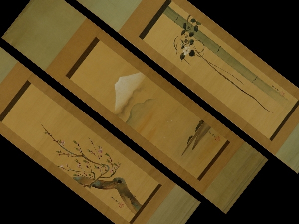 | №2502048【模写】鈴木其一【三対幅・春花図】◆絹本◆識箱◆掛軸 | |