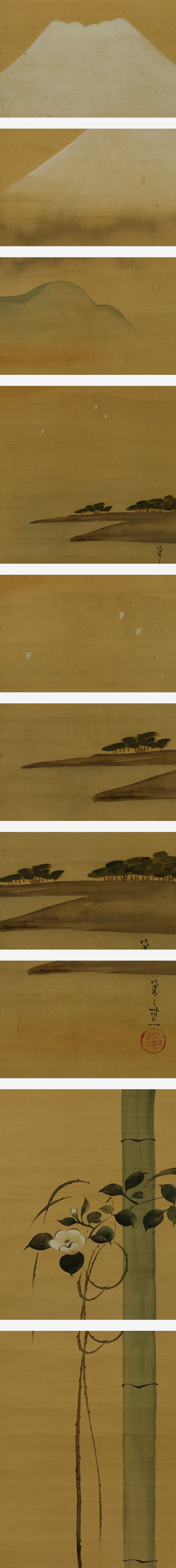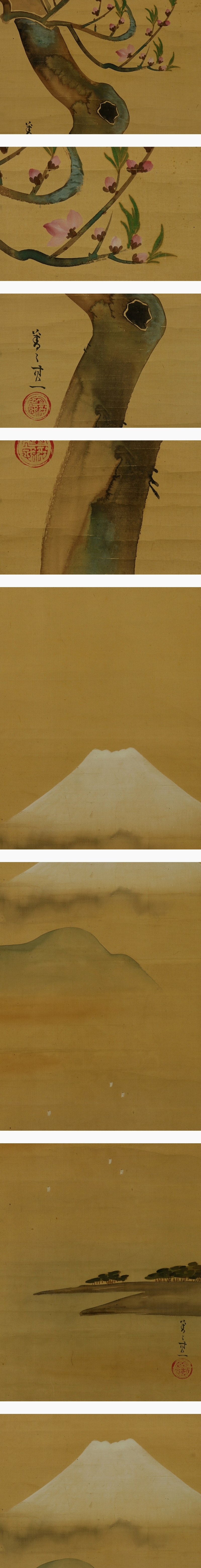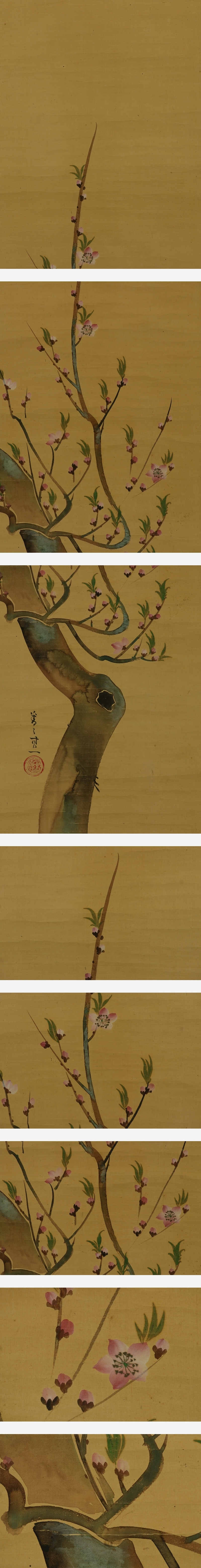 鈴木其一 すずき-きいつ(1796-1858) 江戸時代後期の画家。 寛政8年4月生まれ。 琳派の酒井抱一の内弟子となり,同門の鈴木蠣潭没後,鈴木家を継ぐ。 大胆な装飾的画風が特色。 安政5年9月10日死去。63歳。江戸出身。 名は元長。字は子淵。通称は為三郎。別号に噲々,菁々,祝琳斎。 本紙は、染み、汚れ、強い折れ、皺、ヤケ、破れ、剥落があります。 表装は、染み、汚れ、強い折れ、皺、虫食い、破れ、ほつれ、ヤケ、くすみ、 修理痕、軸先に汚れと傷、軸紐に劣化があります。 【サイズ】 作品 横約31.5cm×縦約104cm 表装 横約44.5cm×縦約183cm |