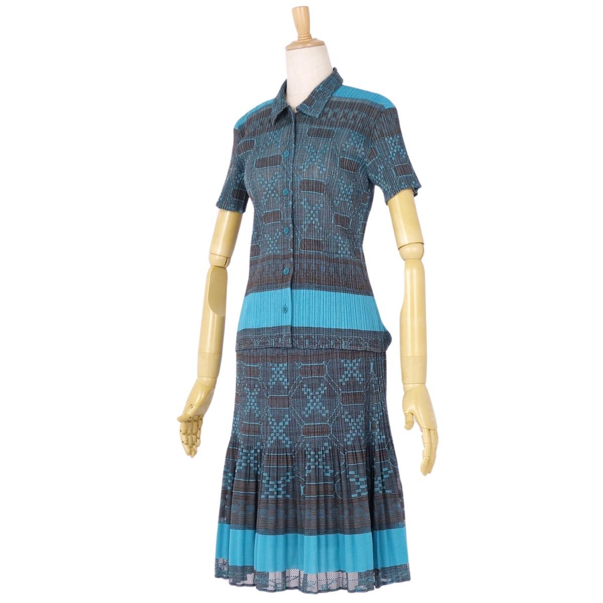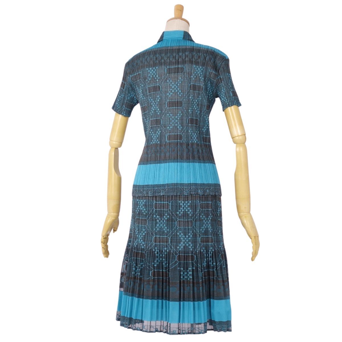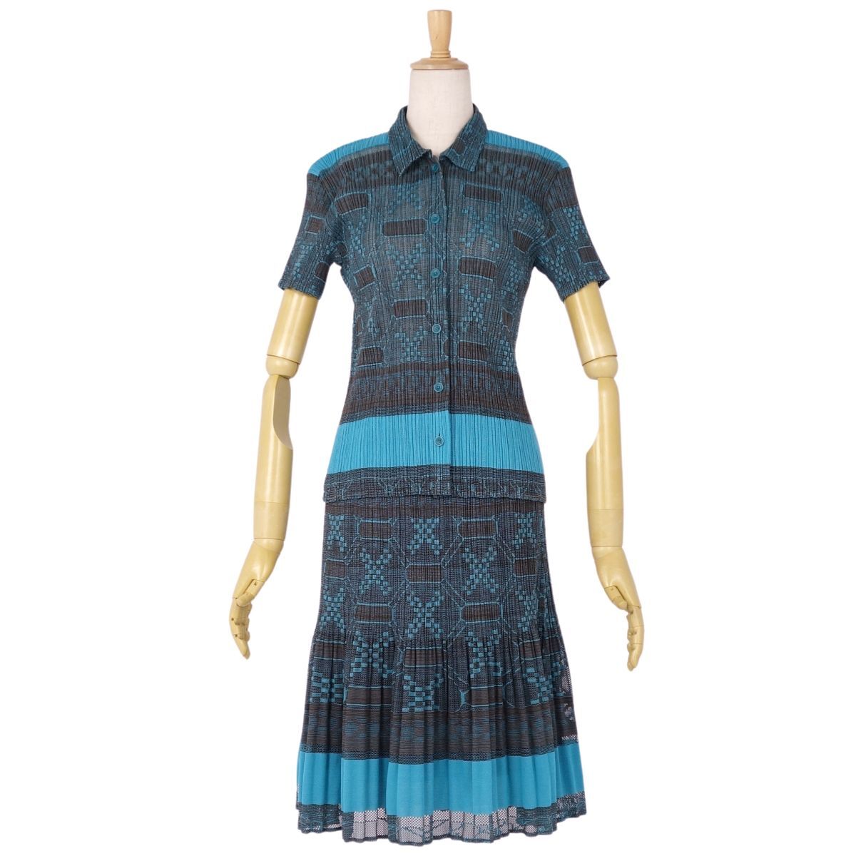| 極美品 プリーツプリーズ イッセイミヤケ PLEATS PLEASE セットアップ スカートスーツ 総柄 プリーツ 3ターコイズブルー |