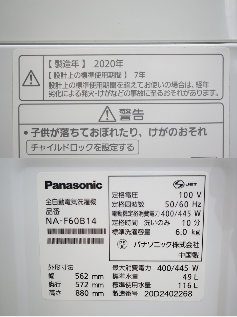 パナソニック | NA-F60B14・2020年 | 本体 約88.0 x 56.2 x 57.2cm |