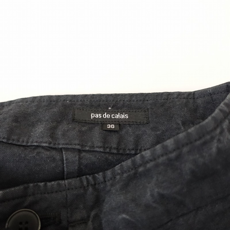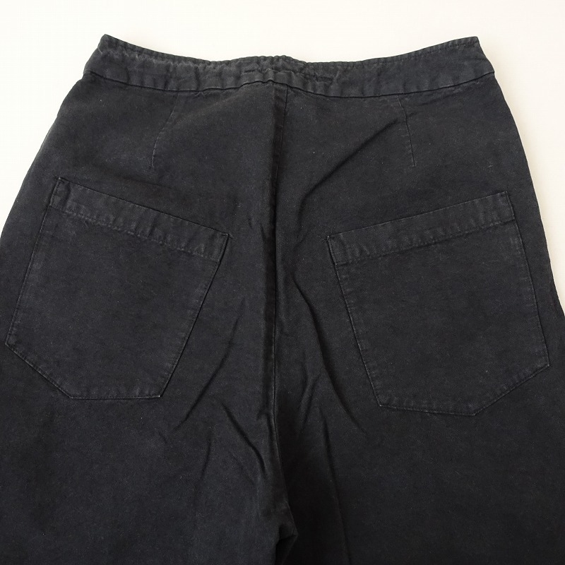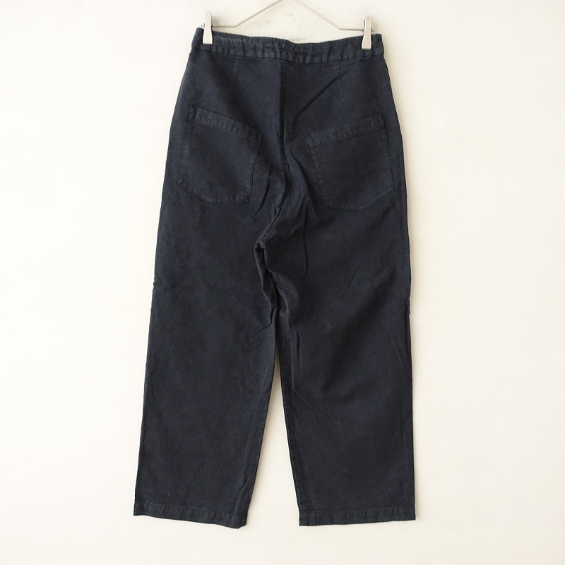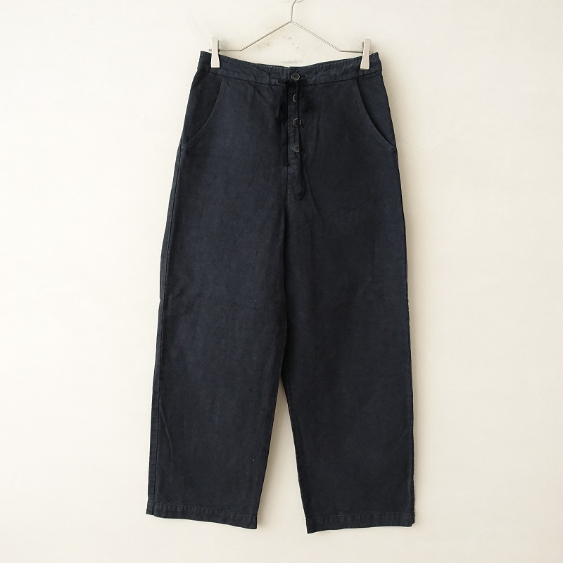 pas de calaisのコットンリネンワイドパンツです。カラーはネイビーで、製品染めが施されております。ウエストはひも入り、フロント開口部はすべてボタン仕様で、ポケットは4つ付きです。 |
