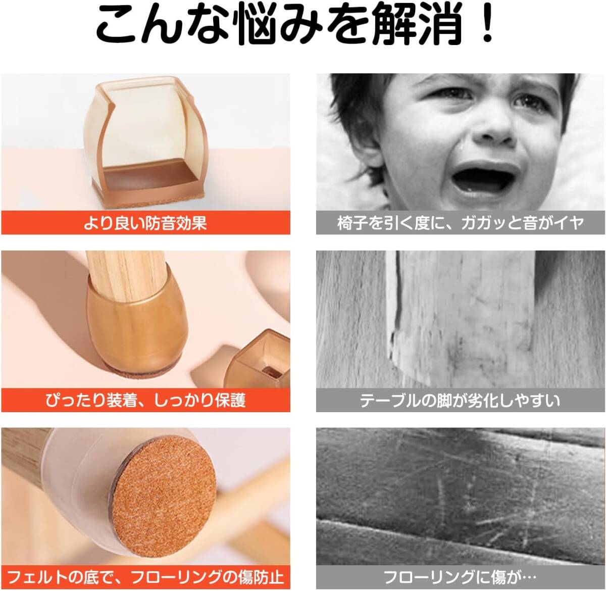 【大切な床を傷から守る椅子脚カバー】椅子を引く度にガガッと音、フローリングに傷がつくとこんなお悩みがありませんか?この椅子脚カバーは底部にフェルト付きデザインで椅子を引く時もほどよく滑って、引き出しもやすい。重い椅子やテーブルなどの家具の移動も楽々!長時間使用しても壊れや劣化する心配もなく、床の傷予防!