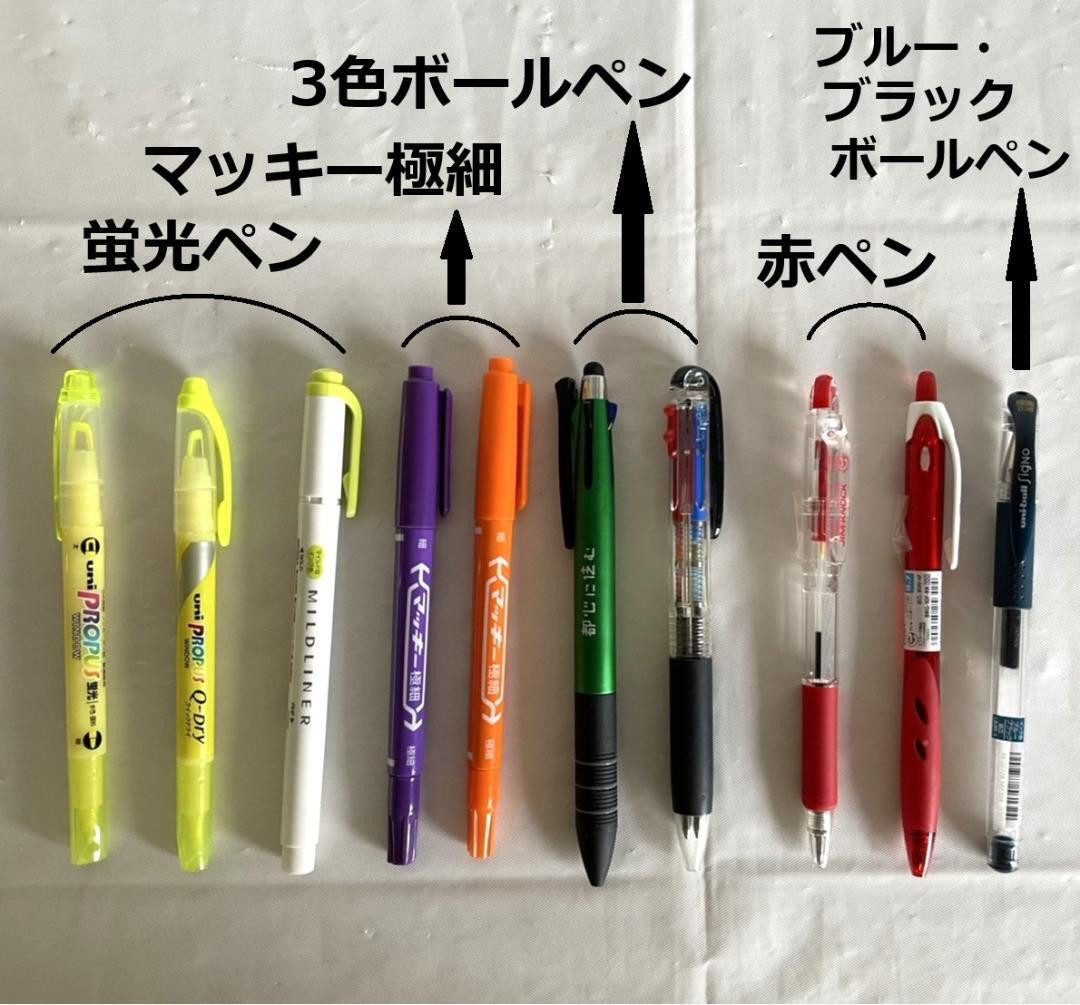 黒のボールペン、色付きボールペン、サインペン、蛍光ペン、