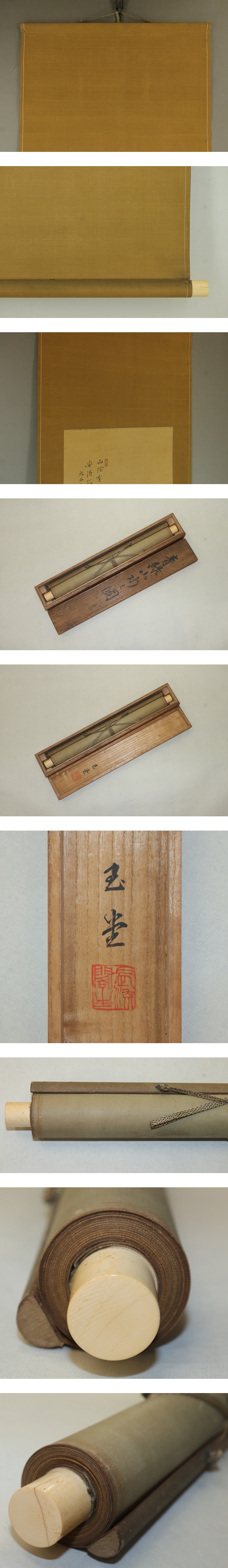 川合玉堂 かわい-ぎょくどう(1873-1957) 日本画家。愛知県生。 名は芳三郎。別号に偶庵。望月玉泉・幸野楳嶺・橋本雅邦に師事。 日本の自然を詩情豊かに平明に描き続け、独自の画風を確立。 横山大観・竹内栖鳳と共に日本画壇の三巨匠。 帝室技芸員・帝国美術院会員。文化功労者。文化勲章受章。昭和32年(1957)歿、83才。 本紙は、染み、汚れ、折れ、皺、ヤケがあります。 表装は、染み、汚れ、折れ、皺、虫食い、破れ、ほつれ、くすみ、ヤケ、 軸先に擦れとヒビがあります。 【サイズ】 作品 横約28.5cm×縦約134.5cm 表装 横約40cm×縦約199cm |
