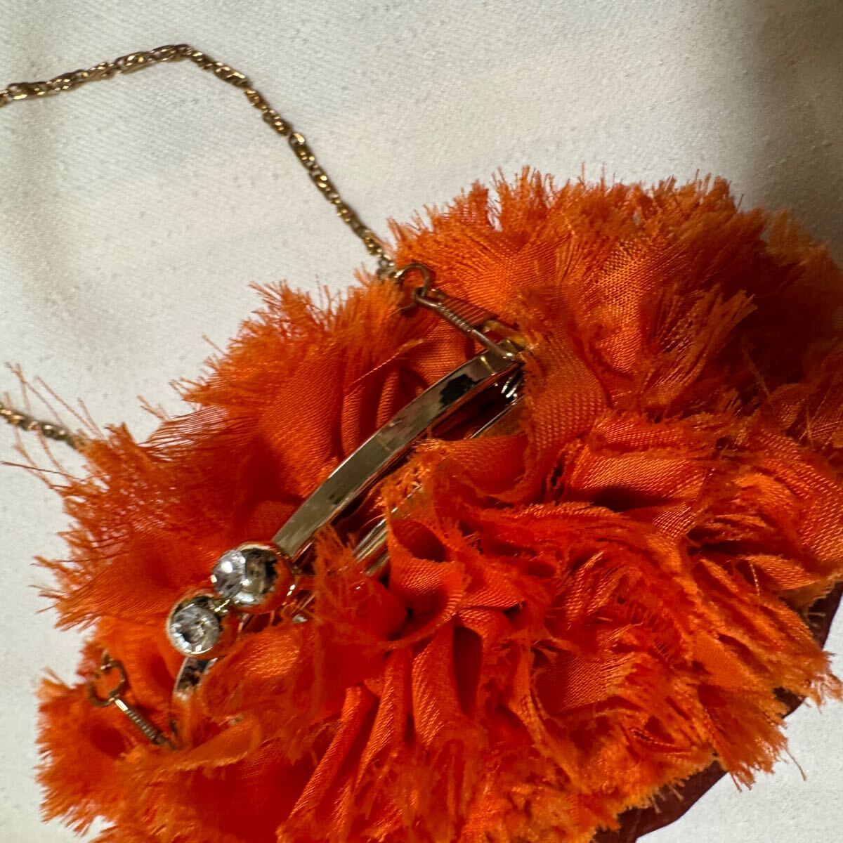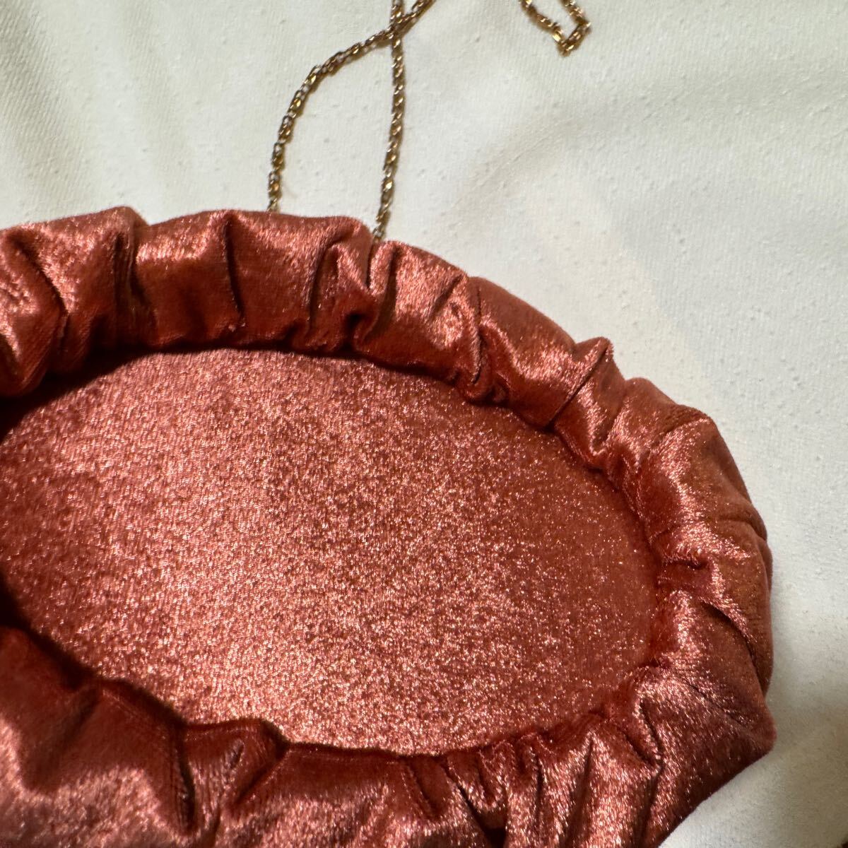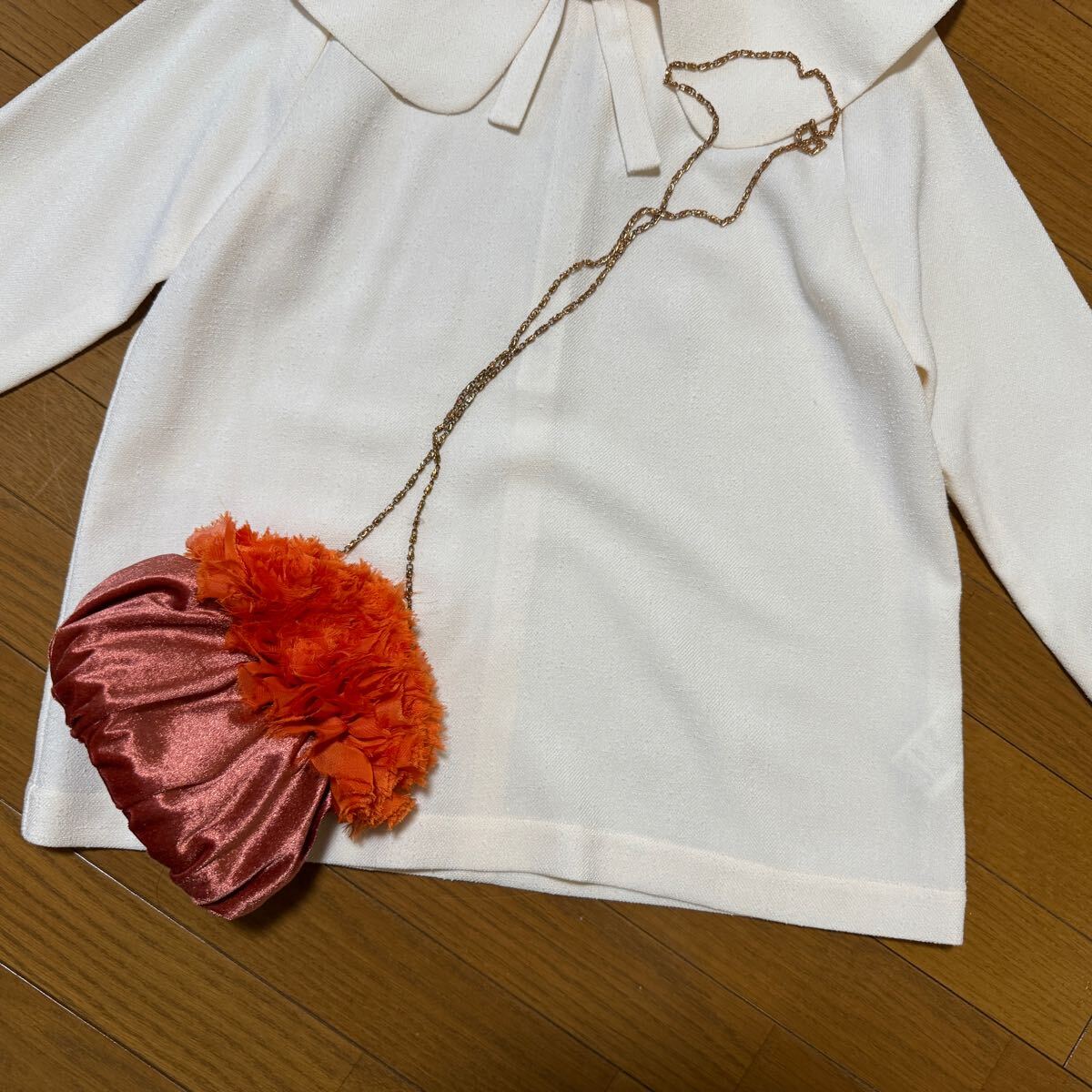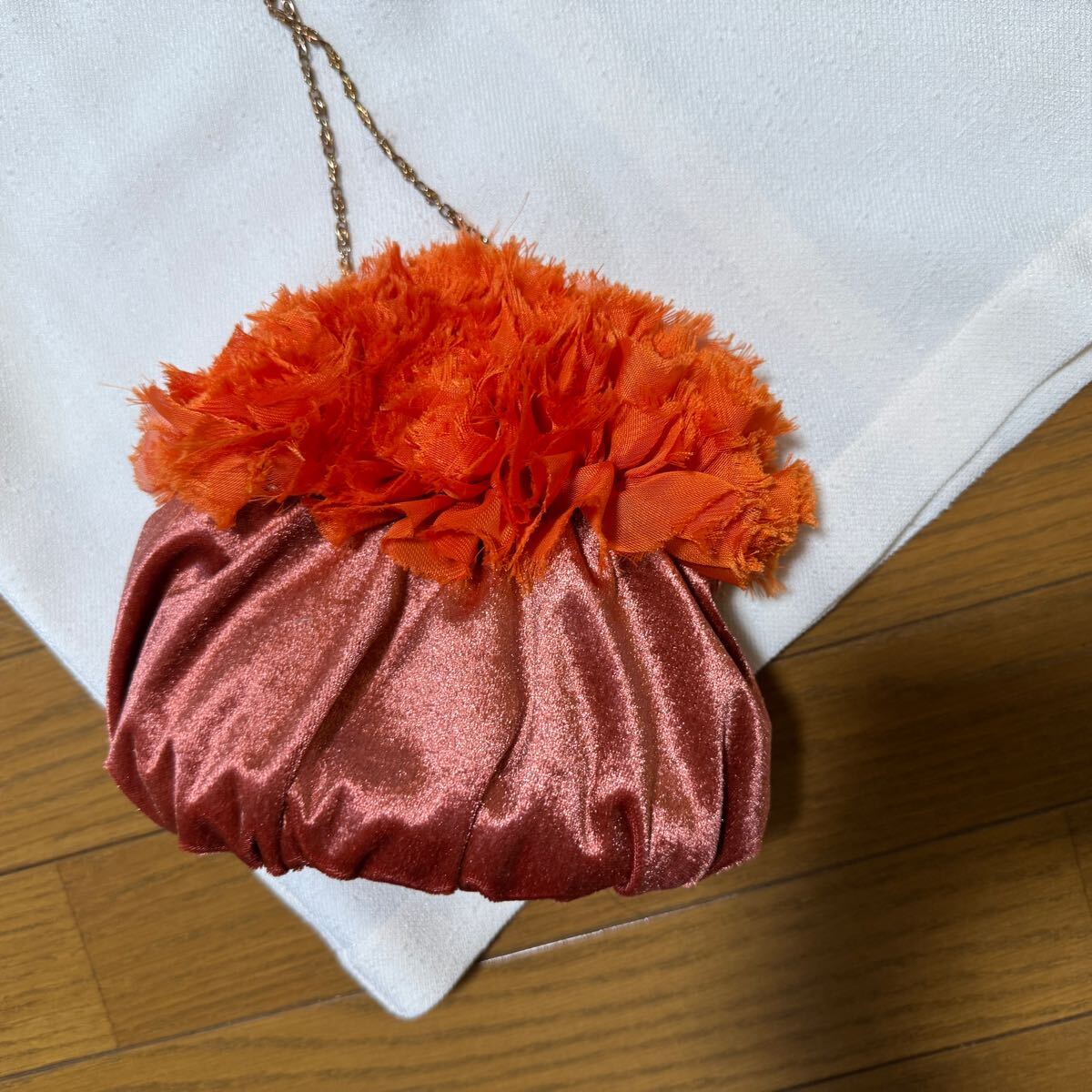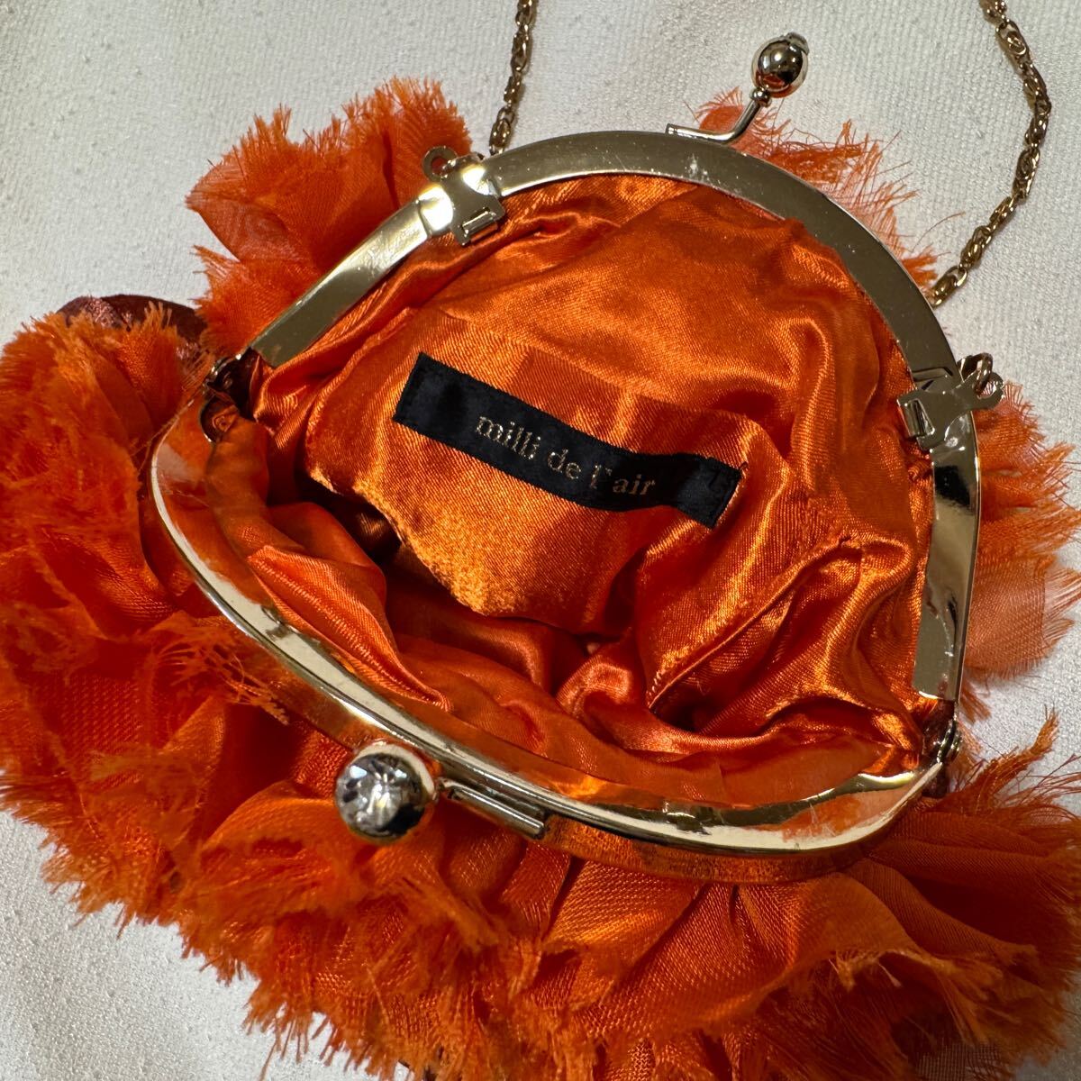 milli de l'air ミリデレールのバッグです。小ぶりのサテン生地巾着型に、オレンジの花弁のような装飾がついていて、細めのゴールドチェーンもとてもかわいいです。普段使いはもちろん、ちょっとしたパーティ用にもお使いいただけそうです。購入後、試着のみで保管しておりました。新品未使用品です。自宅保管が気になる方はご遠慮ください。