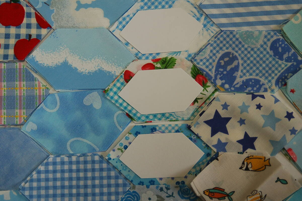 パッチワーク用細長六角形出来上がりサイズ22㎜に裁断してます。