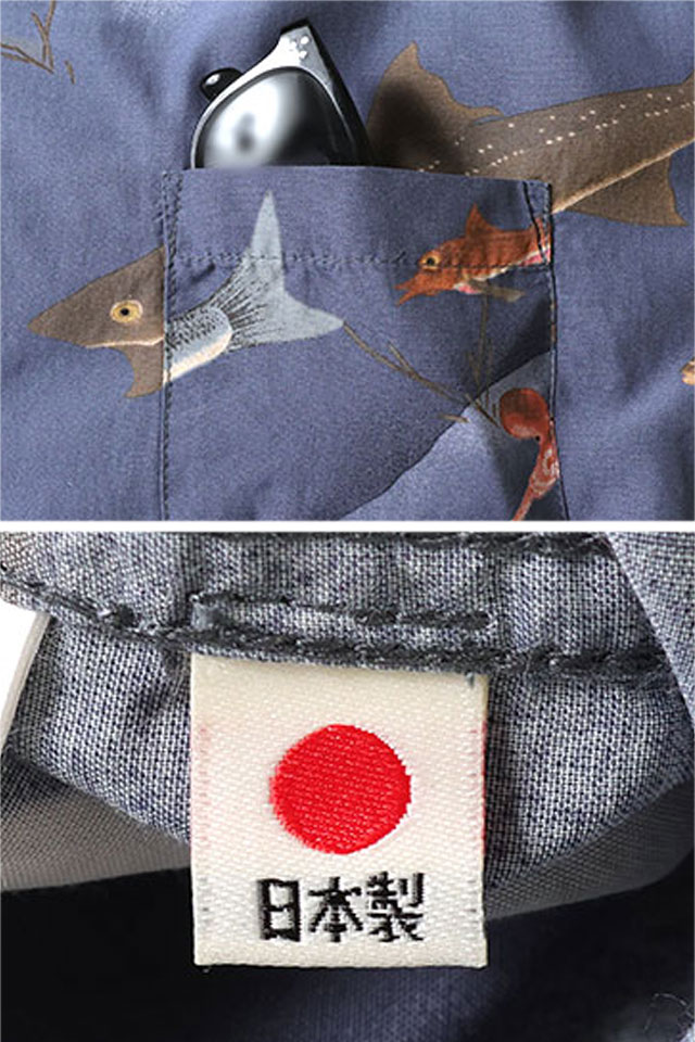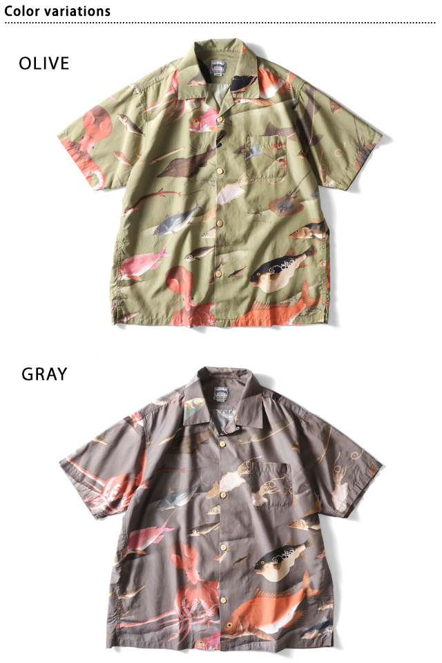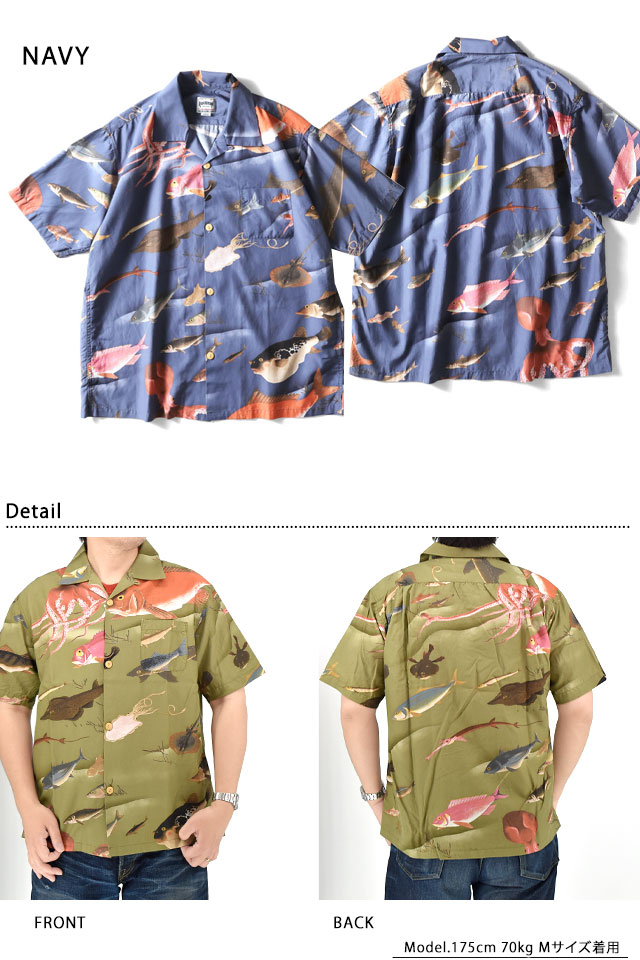 日本で初めてオリジナルのフライトジャケットを生み出し、その後も数々の国内製ミリタリー商品を製造する「ヒューストン」から、日本製コットンレーヨンアロハシャツ「伊藤若冲・魚尽くし」(41170)のご紹介です。 伊藤若冲の「諸魚図」と「群魚図」の2対からなり、通称【魚尽くし】と呼ばれる作品を総柄に仕立てたスペシャルなアロハシャツです。 日本製の生地を使用し、国内工場にて縫製しているスペシャルなアロハシャツシリーズ。 ヴィンテージのアロハによく見られる、エットと呼ばれる高密度に織り上げたコットンレーヨンを再現しています。 | |||||||||||||||||||||||||