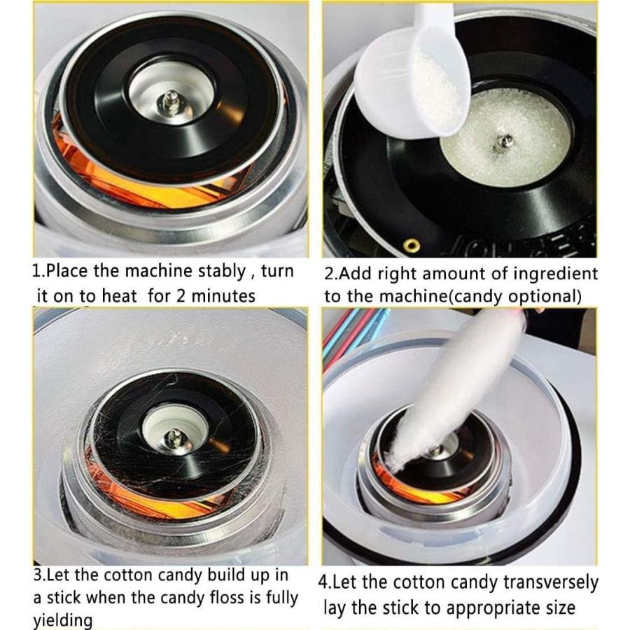 幅広い用途:顆粒砂糖だけでなく、キャンディ、ハードキャンディ、ソフトキャンディも簡単に操作でき、ホームパーティー、子供の誕生日、ギフト、業務用綿菓子製造機などに適しています。電圧 220v,50hz,業務用、家庭用。