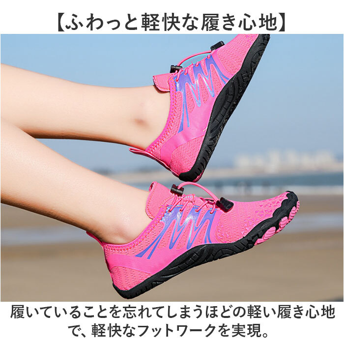 | 商品説明 | ・・【水陸両用で使える万能さ】 ・まるで素足のように軽くて快適!トレーニングシューズが新登場。 ・【ふわっと軽快な履き心地】 ・履いていることを忘れてしまうほどの軽い履き心地で、軽快なフットワークを実現。 ・【ぐ~んと伸びて、足にフィット】 ・伸縮性に優れたニット生地がつま先からかかとまでぴったりフィット! ・【通気性抜群のニット素材】 ・・アッパーはメッシュ状のニット生地で通気性が高く、気になるムレ対策にも効果的。 ・【衝撃吸収インソール】 ・クッション性のあるインソールが足裏にかかる衝撃を吸収し、足裏に優しい仕上がり。 ・【水がたまらない排水穴付き】 ・ソールの排水穴からも水が抜けるため、早く乾いて快適さをキープ。 ・【自分サイズに調節可能】 ・ドローコードで足の甲の高さに合わせてサイズ調整も自在に調節可能。 ・【滑りにくいアウトソール】 ・つま先に足指の凹凸を再現したアウトソール。素足のように地面をグリップ。かかとまで溝付き ・【お手入れ簡単、いつでも清潔】 ・インソールは取り外しができるので、手軽に水洗いができていつでも清潔さをキープ。 |