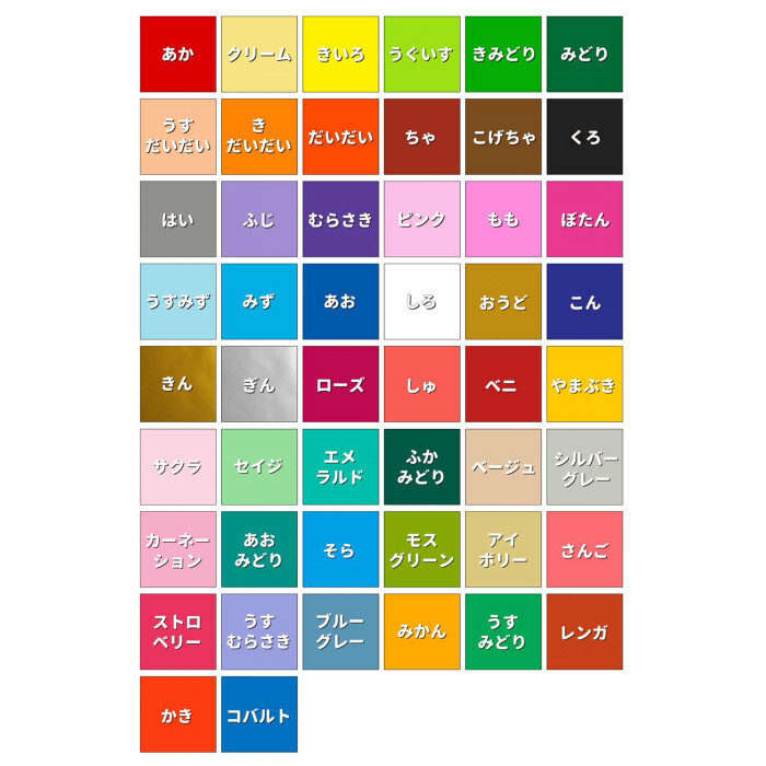 仕様 | 【50色入り】 あか・クリーム・きいろ・うぐいす・きみどり・みどり・うすだいだい・きだいだい・だいだい・ちゃ・くろ・はい・ふじ・むらさき・ピンク・もも・ぼたん・うすみず・みず・あお・しろ・おうど・こん・きん・ぎん・ローズ・しゅ・ベニ・やまぶき・サクラ・セイジ・エメラルド・ふかみどり・ベージュ・シルバーグレー・カーネーション・あおみどり・そら・モスグリーン・アイボリー・さんご・ストロベリー・うすむらさき・ブルーグレー・みかん・うすみどり・レンガ・かき・コバルト |