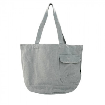 | 原料のわたは、裁断工場で不要になった裁断くずや生地を使用。もとの色をそのままに活かした環境にやさしいアップサイクル糸です。内側には大きめのポケットとボトルホルダー、外側には出し入れ便利なルーポケット付き。中身の整理がしやすく、出し入れしやすいつくりです。 |