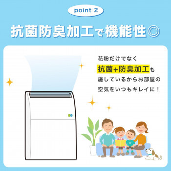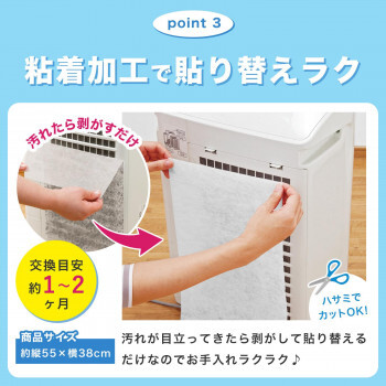 抗菌防臭加工の不織布フィルター。一度キャッチしたホコリ・花粉を捕まえたまま再飛散させない「花粉吸着加工」も施し、機能性◎。シールタイプなのでフィルター部分に貼るだけでOK。汚れたら貼り替えるだけなのでお掃除ラクラク! |