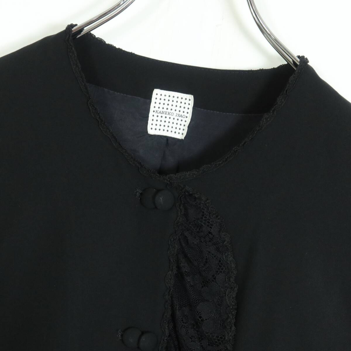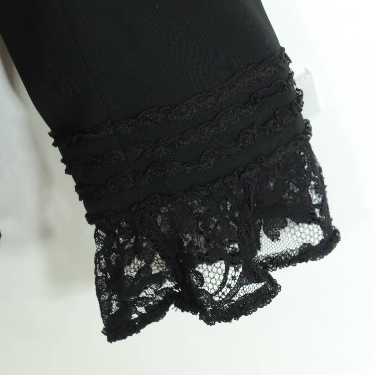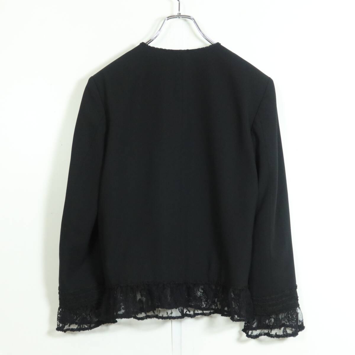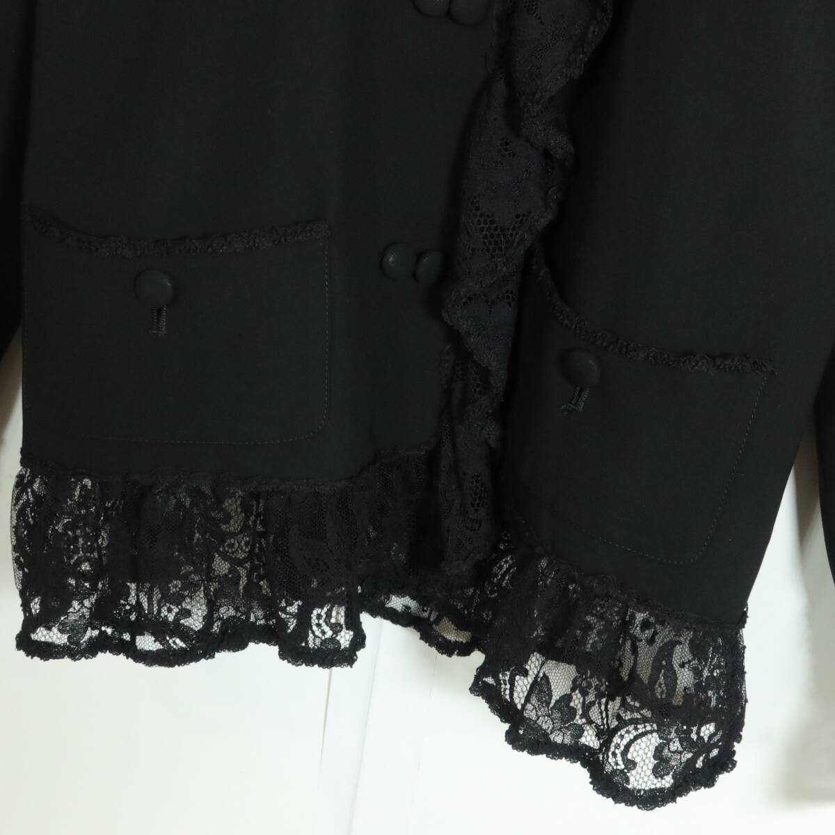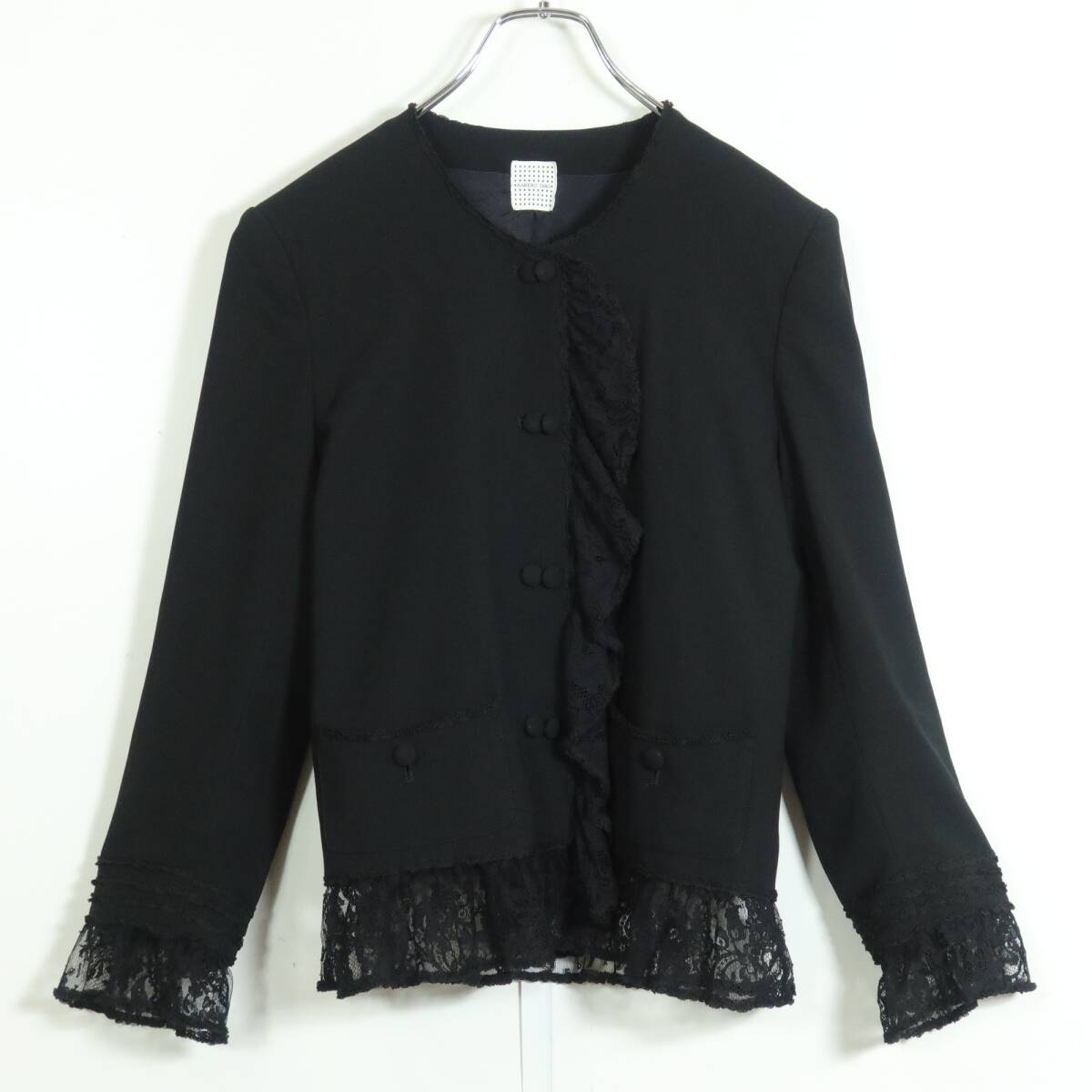 商品説明 | 【実寸約】肩幅40袖丈55バスト96着丈60(cm) 【サイズ表記】 表記なし(実寸をご参照ください) 【素材】ポリエステル100% 【状態】使用感少なめの美品 ボタンにややスレ感がございます。 【デザイン】黒系 上品な印象のノーカラージャケットです。 片側レースデザインとダブルボタンが目を惹く♪ 様々な場面で大活躍の素敵な一着です。 薄手/無地/裏地あり /肩パットあり/ポケットあり |
