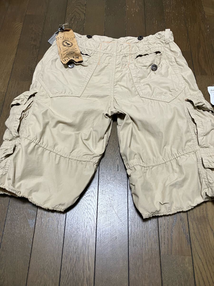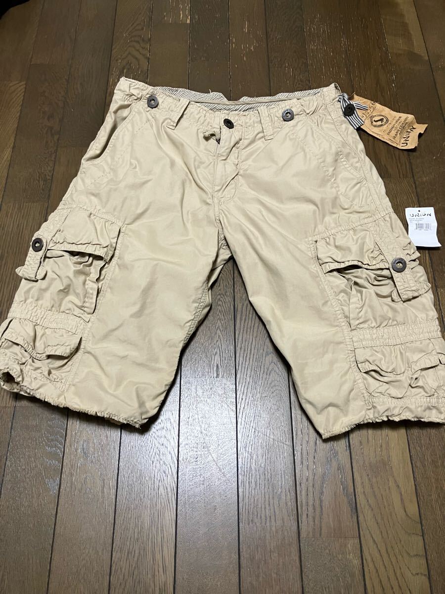 ベージュのカーゴショートパンツ、サイドポケット付きで機能的。