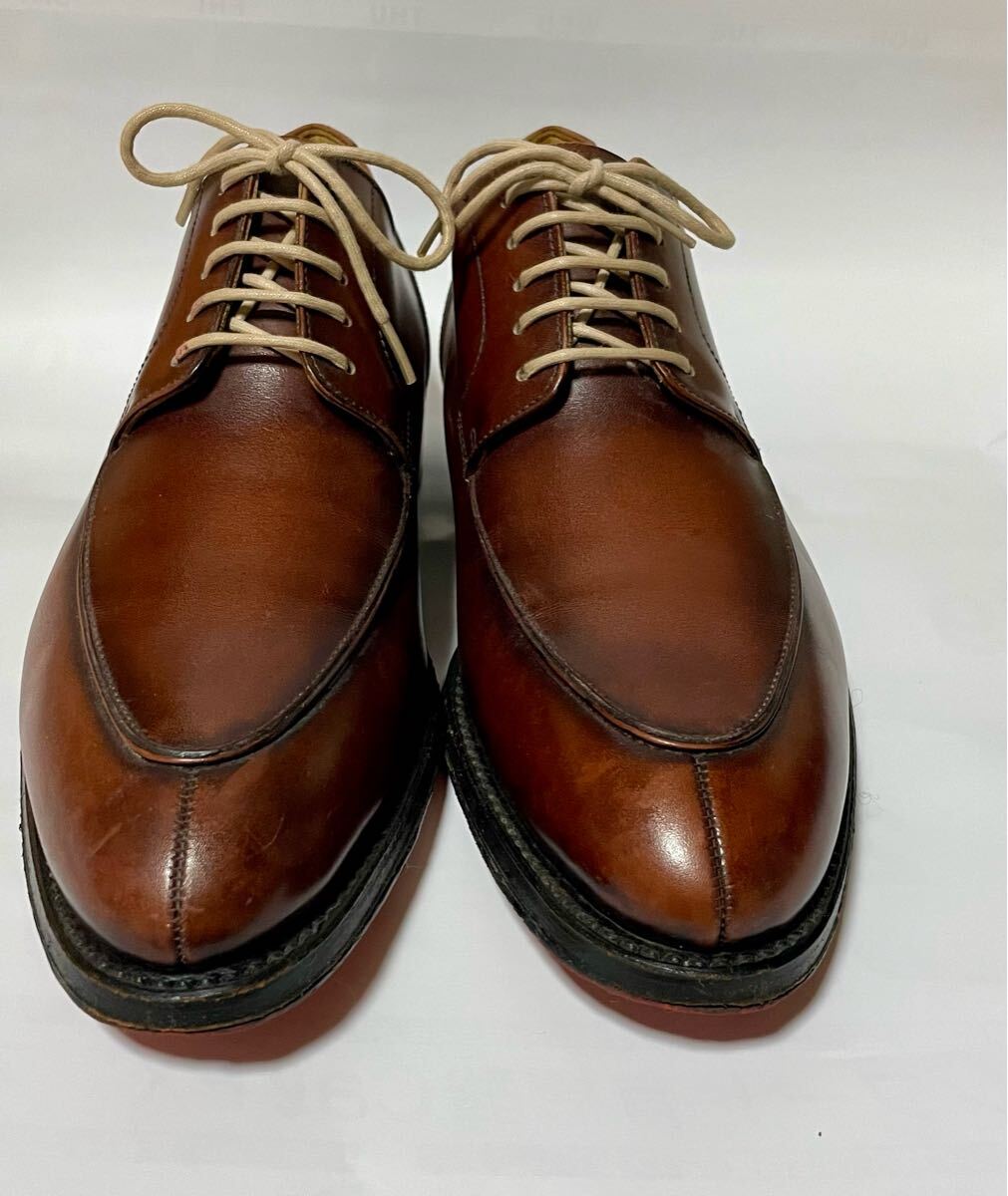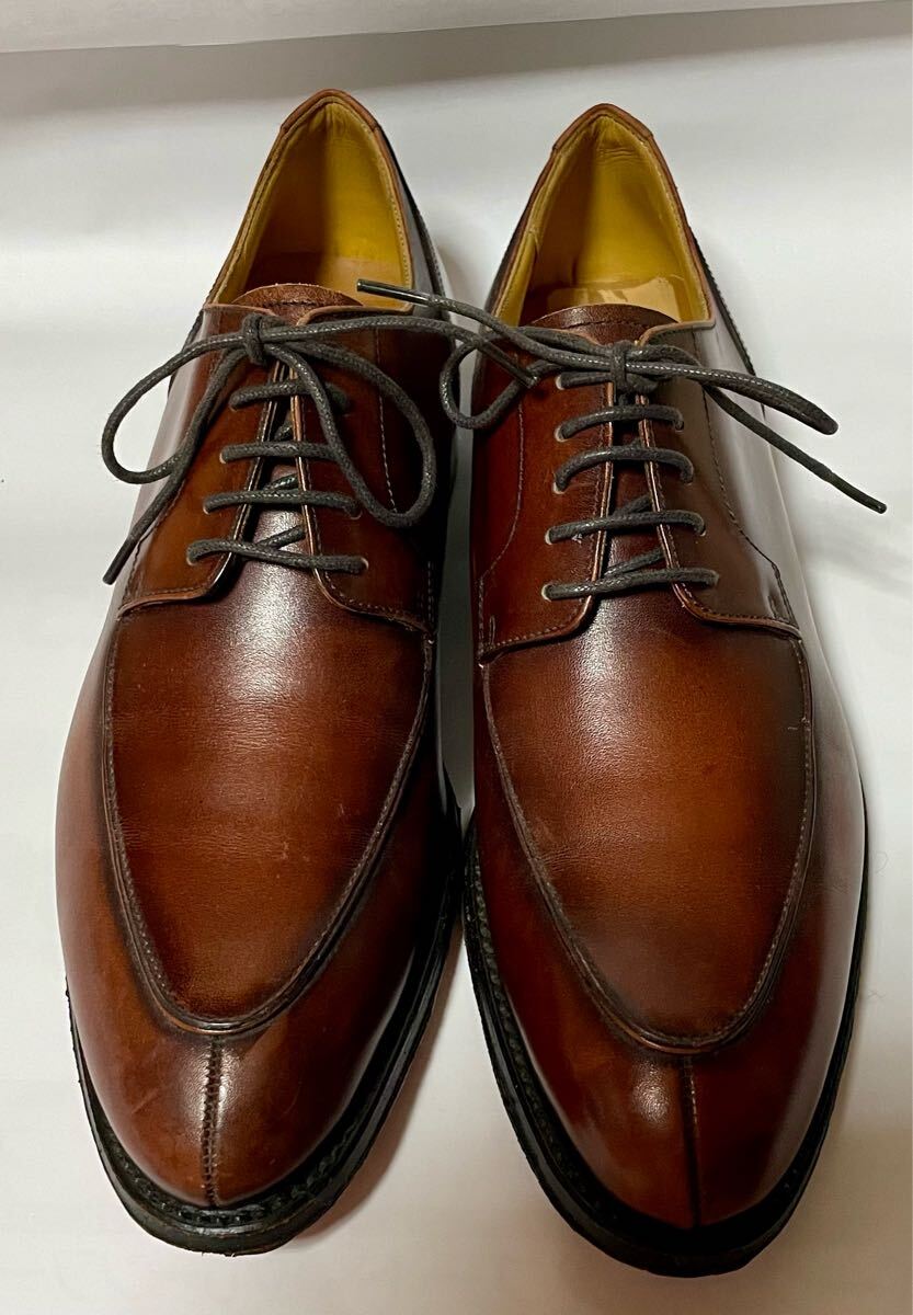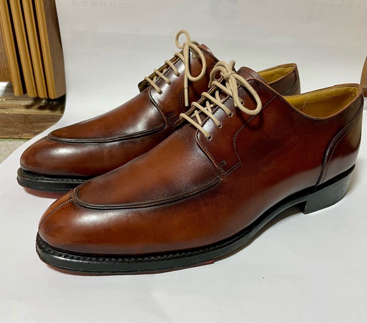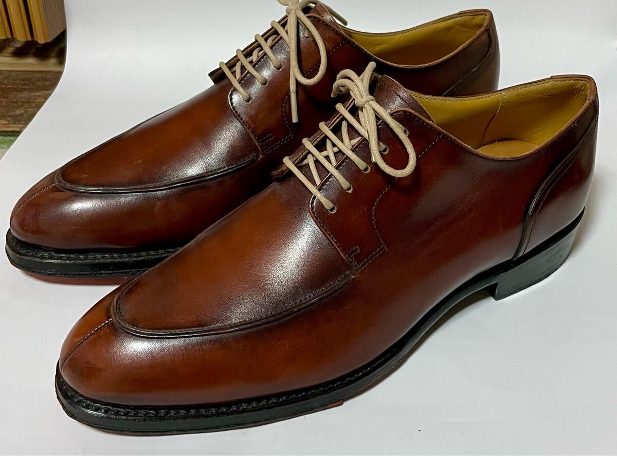 現行モデルはイタリアンレザーのキップレザー(生後6ヶ月〜2年未満の牛)なのでアッパーの革はこの旧モデルの方がアノネイカーフなので良いものを使っていると思います。現行モデルは同等品で定価58300円です。中古ですがそれほど履いていないので型崩れ大きな皺とはありません。小傷とソールは少し減っている部分はあります。