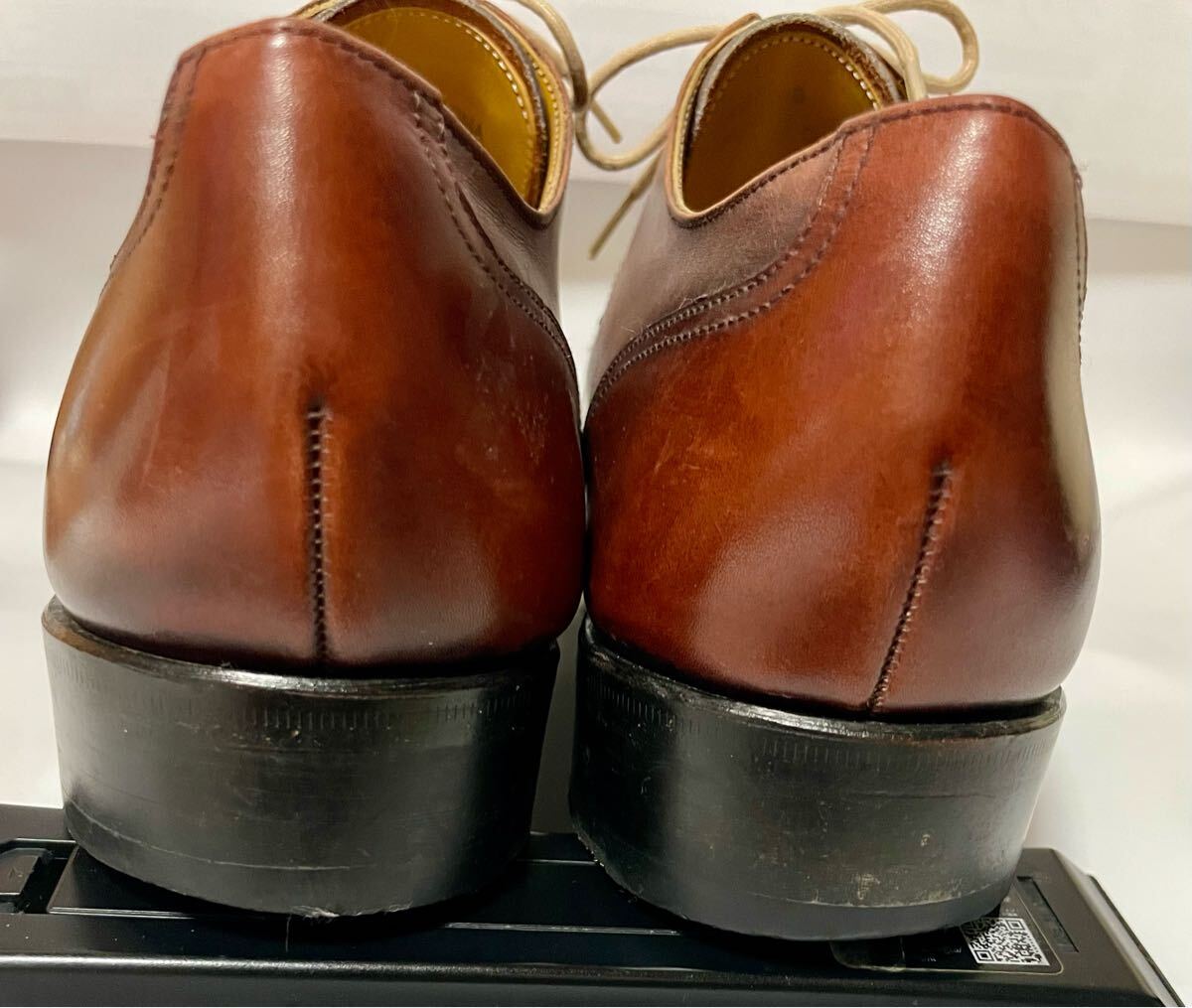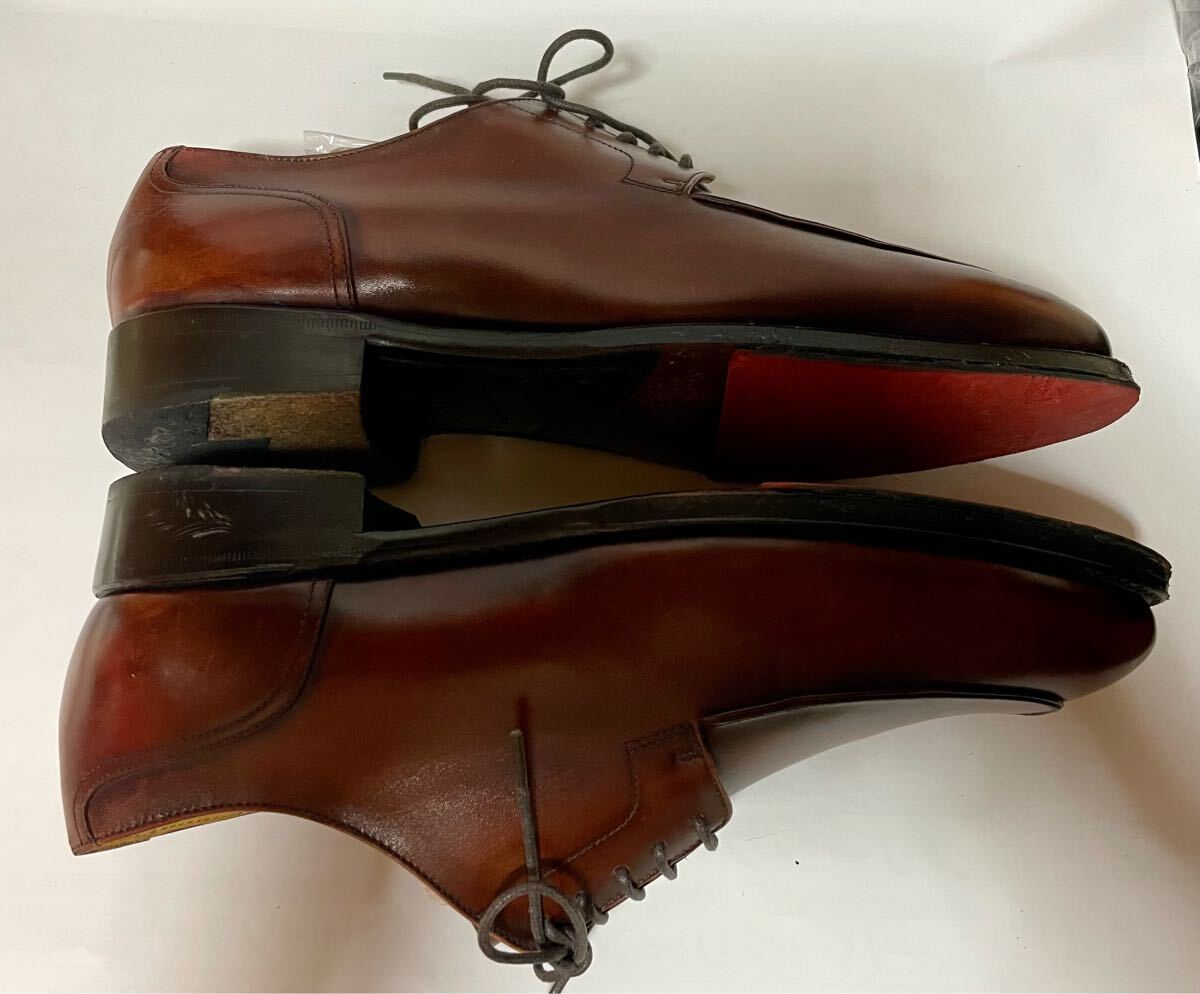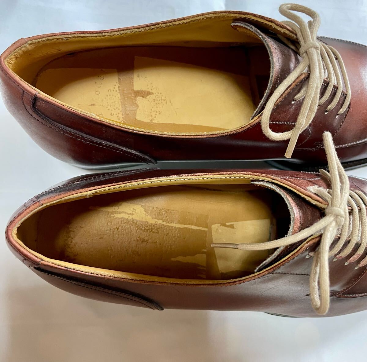 現行モデルはイタリアンレザーのキップレザー(生後6ヶ月〜2年未満の牛)なのでアッパーの革はこの旧モデルの方がアノネイカーフなので良いものを使っていると思います。現行モデルは同等品で定価58300円です。中古ですがそれほど履いていないので型崩れ大きな皺とはありません。小傷とソールは少し減っている部分はあります。