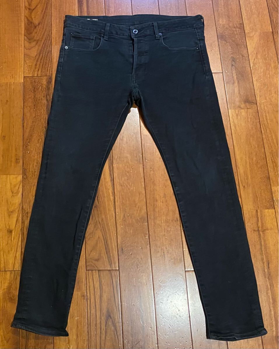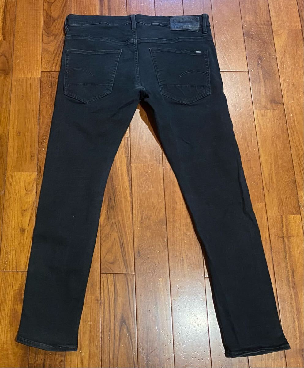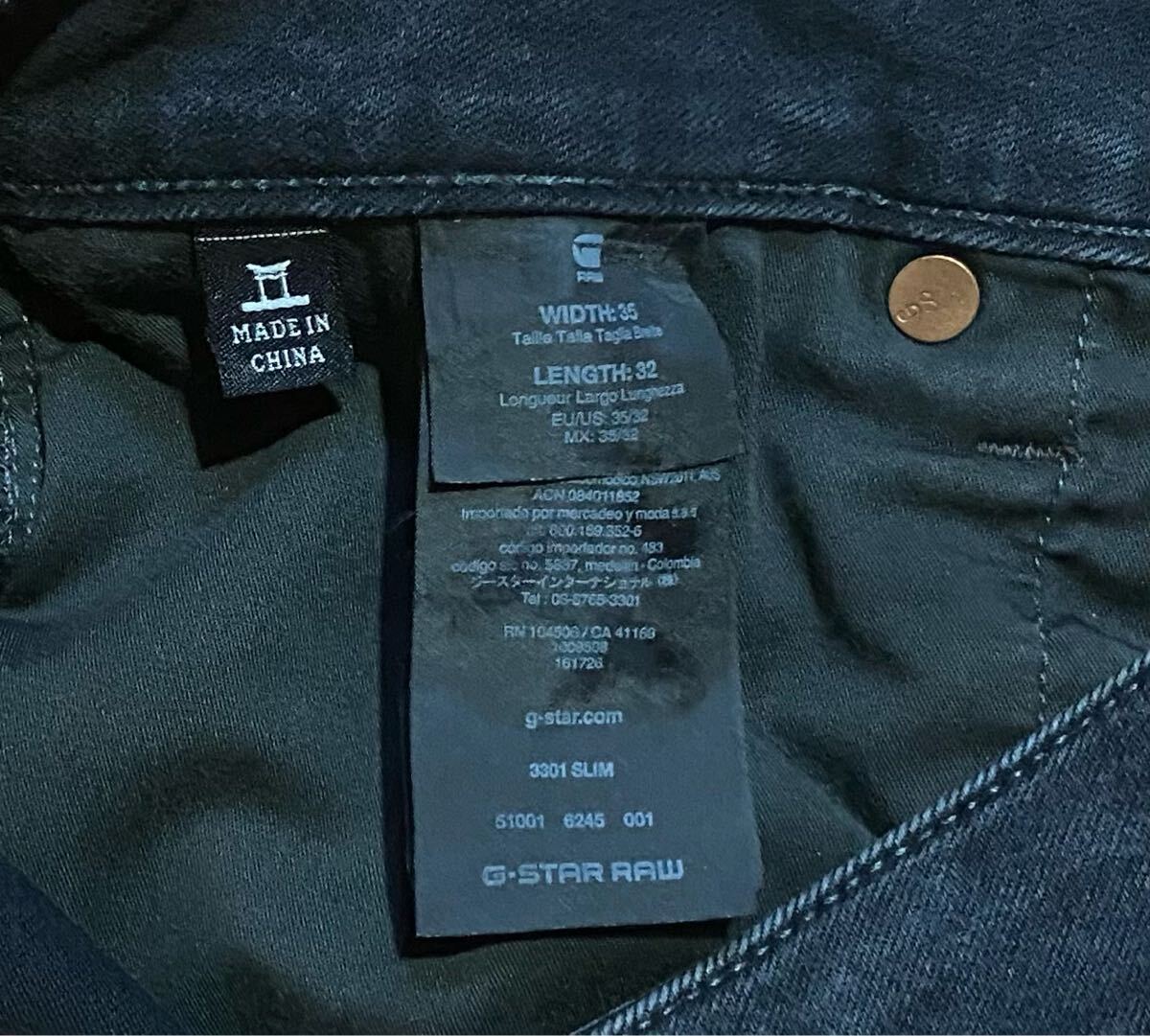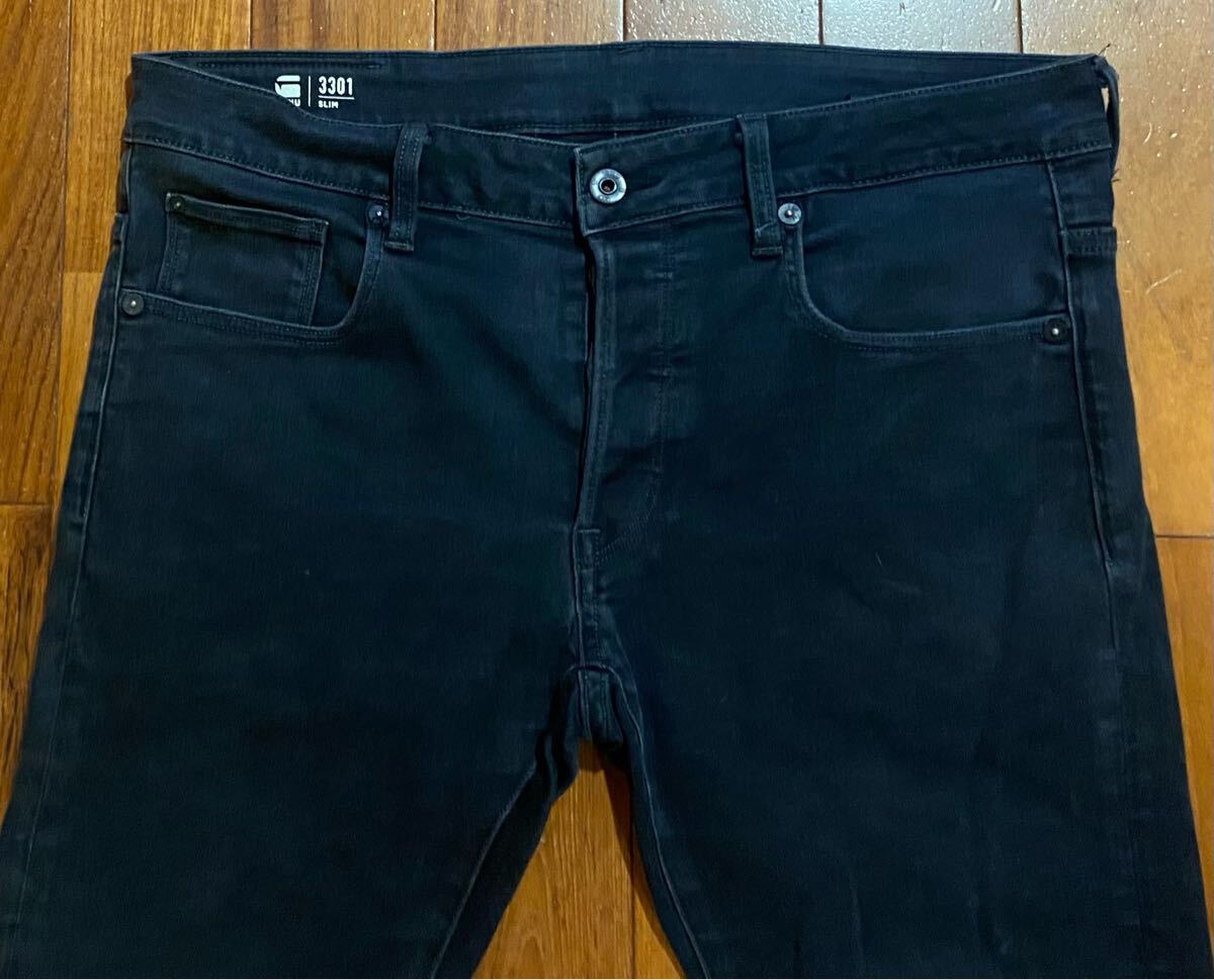 ジースターロウのストレッチデニム(ジーンズ)、3301 SLIM 51001 6245 001です。USEDですが状態は良いです(10段階中8程度)。牛革パッチ、ボタンフライ、裾はチェーンステッチです。生地はストレッチ入りで綿99%、ポリウレタン1%です。正規品です(ジースターインターナショナル(株)、中国製)。サイズはW35でウエストは重ねずに平置きで約92cm、ヒップ約102cm、股上約25cm、股下約76cm、股下15cmのふともも部分約48cm、裾まわり約31cm、重量約570gです。発送はゆうパケットポストになります。