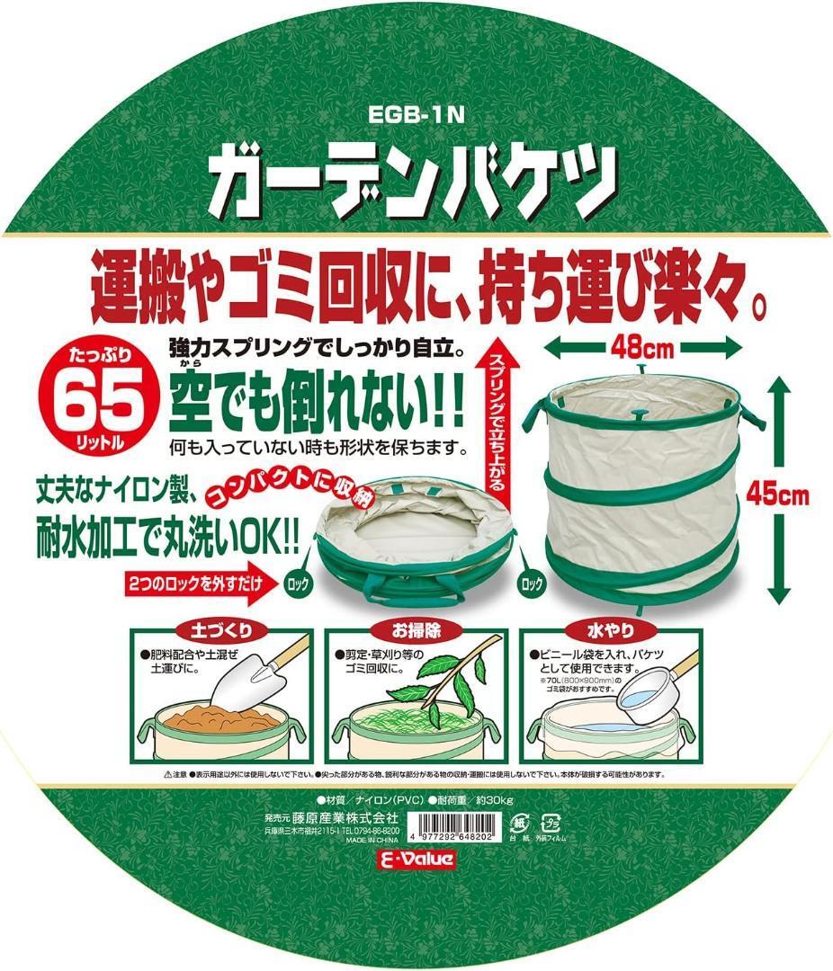 容量:65L サイズ:480×480×450mm 仕様:撥水加工で丸洗い可能 材質:PVC 自立可能で収納もコンパクト、園芸道具の持ち運びや道具入れに ◆空でも倒れない、強力スプリング内蔵 ◆万能バケツ ◆園芸作業全般用 ◆たためばコンパクトに収納できる ◆スプリング内蔵で自立しできる